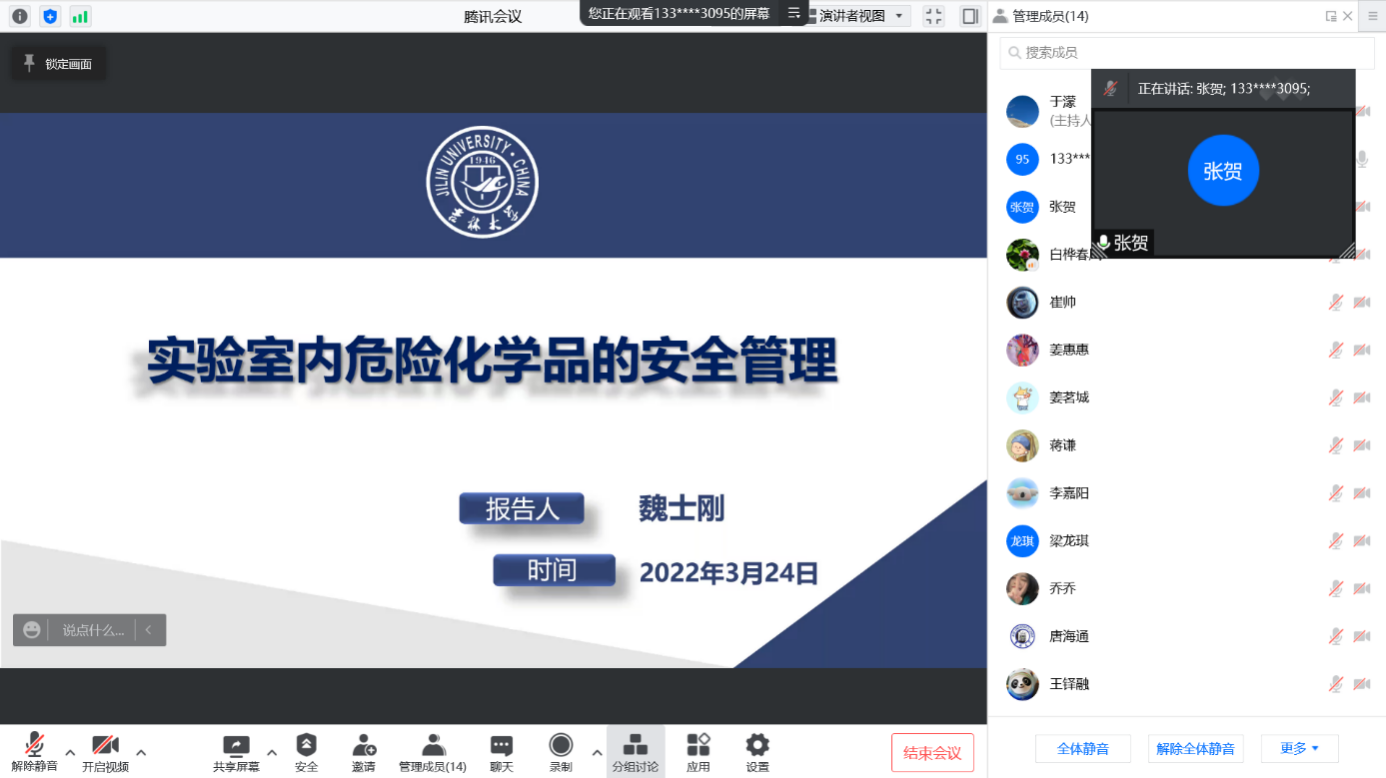 2021级硕士、博士研究生带来精彩的实验室危险化学品安全管理线上专题讲座。讲座由副院长张贺主持。