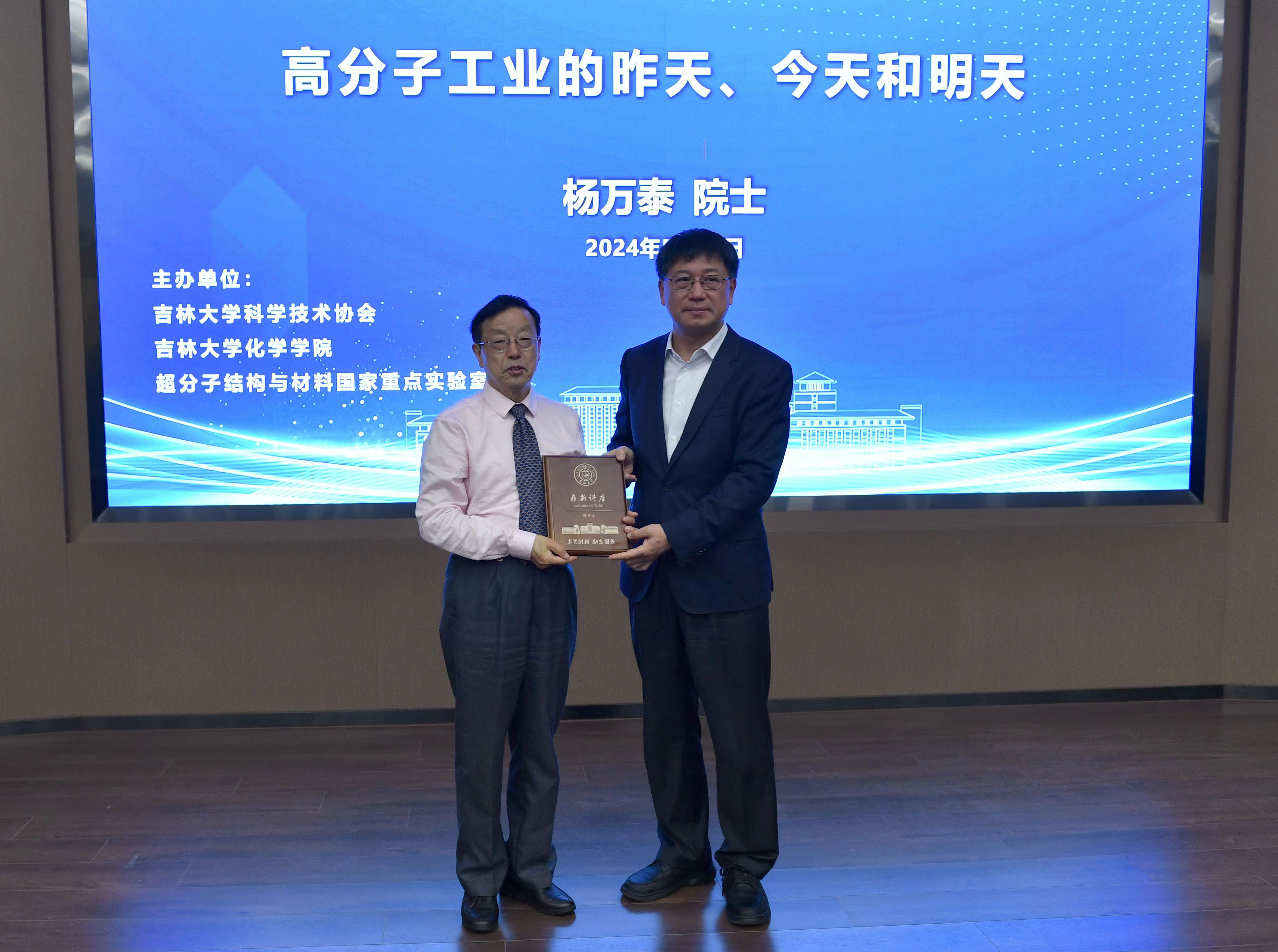 校长张希出席讲座并为杨万泰院士颁发“鼎新讲座纪念牌”。讲座由超分子结构与材料国家重点实验室主任孙俊奇主持。