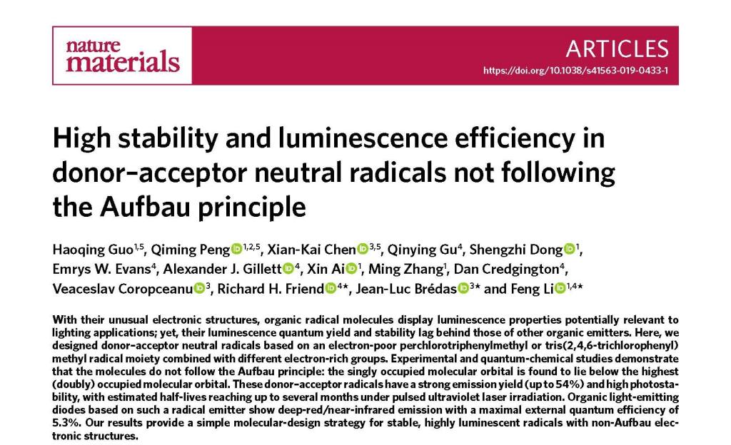 Jean-Luc Brédas教授团队和剑桥大学卡文迪许实验室Richard H. Friend教授团队的合作研究论文“不遵循构造原理的高稳定高发光效率给受体结构中性自由基”(High stability and luminescence efficiency in donor–acceptor neutral radicals not following the Aufbau principle, Nature Materials, 2019, DOI:10.1038/s41563-019-0433-1),黑料正能量