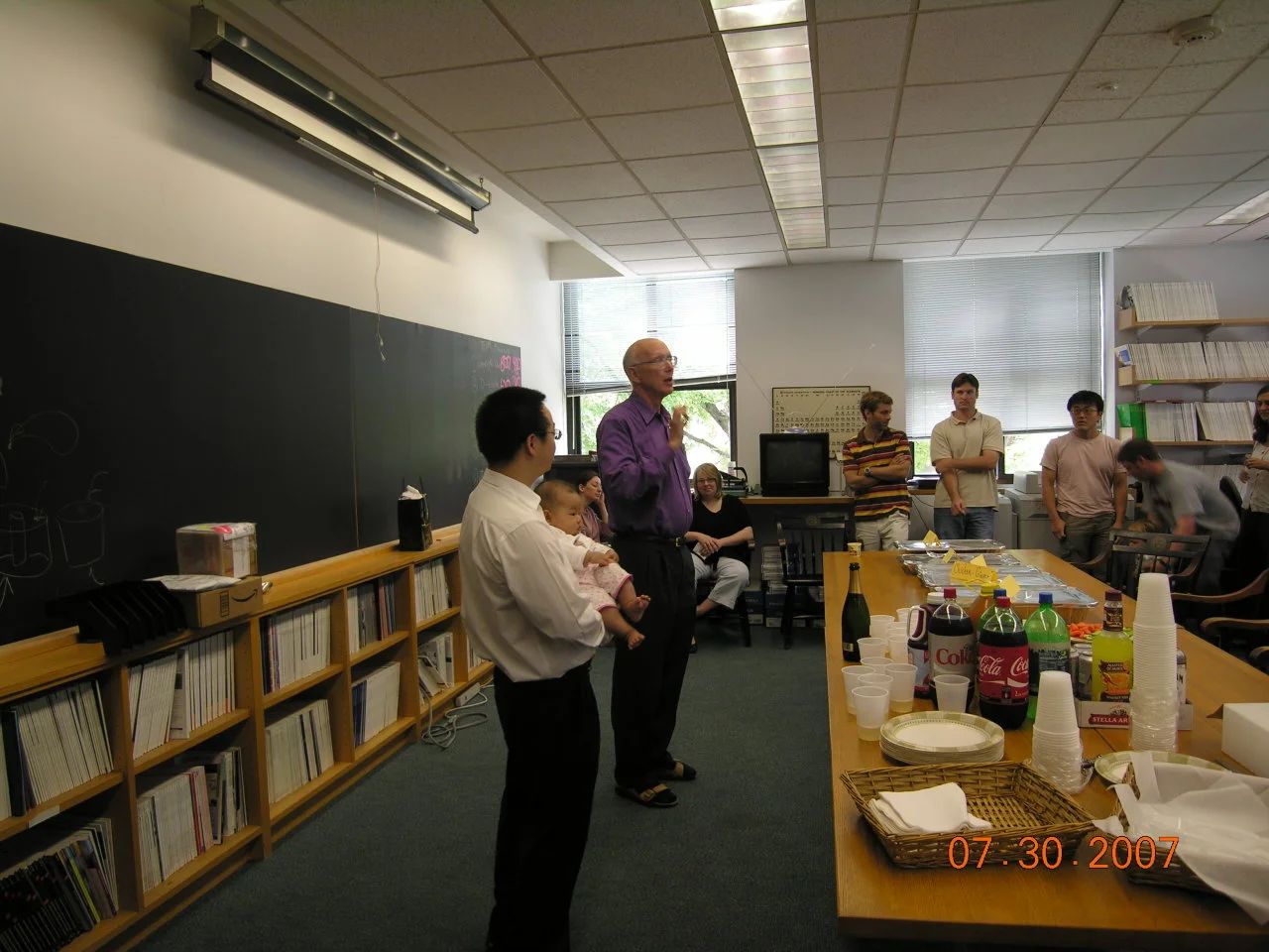 图4 2007年7月摄于哈佛大学化学系Whitesides教授课题组会议室 博士论文答辩后(说话者是博士导师George Whiteside教授,我手里抱着的是我大女儿Angie,4个月大)