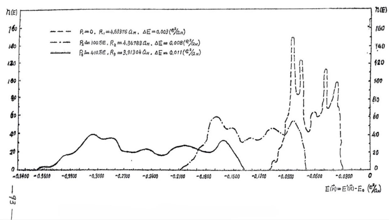 我除了计算常压下的铜、镍的3d能带之外,主要工作是计算100万大气压和410万大气压下铜的3d能带随压力的变化,以及铜的3d闭合壳层排斥势和高压状态方程。固体在常压下的物理模型已经相当清晰。在超高压条件下,电子壳层被压破了,这一状态可以通过费米-狄拉克统计理论来描述,其物理模型同样明确。在强冲击波的波前区域,可产生几百万至一千多万大气压的压强,在这种条件下,电子壳层将破未破,尚无明确的理论模型。无疑,研究这些极端条件下物质的特殊性质,不仅是物理力学工作者最感兴趣的课题,也是国防迫切需要的尖端科技。钾与铜都有4s电子,钾容易压缩,铜不易压缩,其原因就在于铜多了一个3d电子闭合壳层。芶先生提出一个解决这个区域状态方程的方案:将闭合壳层算准了,再与常压下的实验数据结合,构建出高压状态方程。