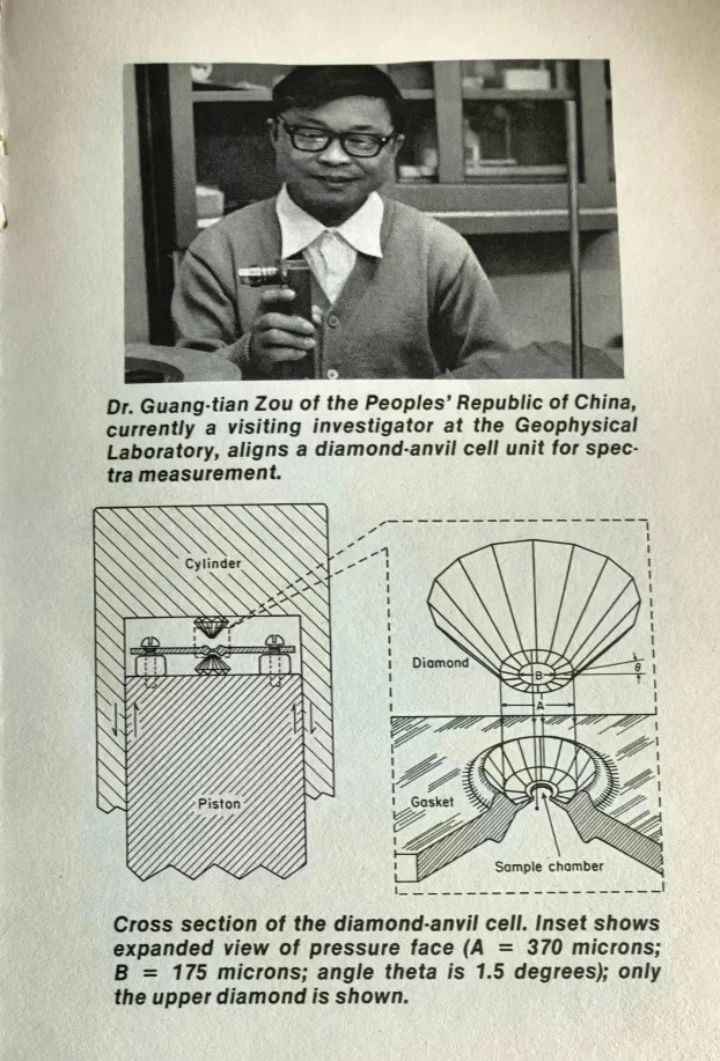 院士,他们每位都是自己领域的顶尖科学家。我按照他们的要求,写了一个关于地幔物质高压研究的实验计划,经该实验室5位专家评审通过,于是就到了该实验室做访问学者。到美国之后,我就按照研究计划,用以毛河光和彼得•贝尔命名的Mao-Bell金刚石对顶压砧,进行了氧化亚铁的高压X光衍射实验。我在国内没有做过这种实验。我花了一周时间,在毛河光的指导下组装金刚石对顶砧,调试两个金刚石砧面要绝对平行。实验开始一个多月,就发现了一条X光衍射谱线增宽,再加压后,谱线发生劈裂。同时,我也测量了高压下氧化亚铁的穆斯堡尔谱,发现了由顺磁的双峰,逐渐变成4个吸收峰,最后变成了6个吸收峰的反铁磁相。这是首次发现地幔模型矿物氧化亚铁的结构和磁性的相变,为研究地球内部结构研究提供了一个全新的结果。