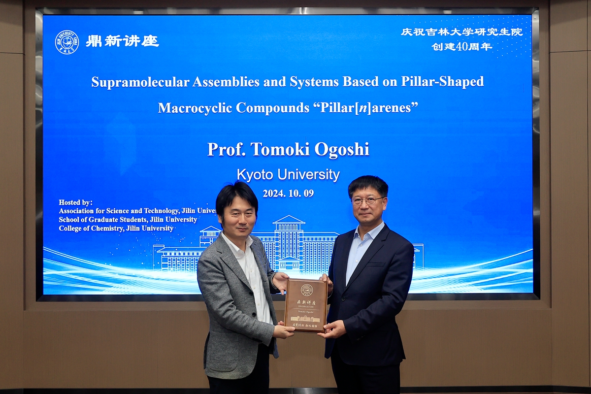 以及中国超分子领域学者的合作历程与深厚友谊,深入浅出地引领大家进入了“柱芳烃”的超分子世界。他通过讲述其团队偶然发现新型大环主体分子“柱芳烃”的历程,向师生们揭示了科学发现背后的机遇与窍门。他强调,科学的突破往往来源于细致观察与不懈探索。基于柱芳烃的独特结构和性质,Tomoki Ogoshi教授介绍了其课题组在柱芳烃功能化、组装以及手性控制等方面取得了一系列创新性进展。在互动环节,Tomoki Ogoshi教授对现场师生提出的专业问题进行了详尽解答,并探讨了柱芳烃未来的发展方向。他的解答不仅启发了在场师生,也为未来的超分子化学研究提供了新的思路。