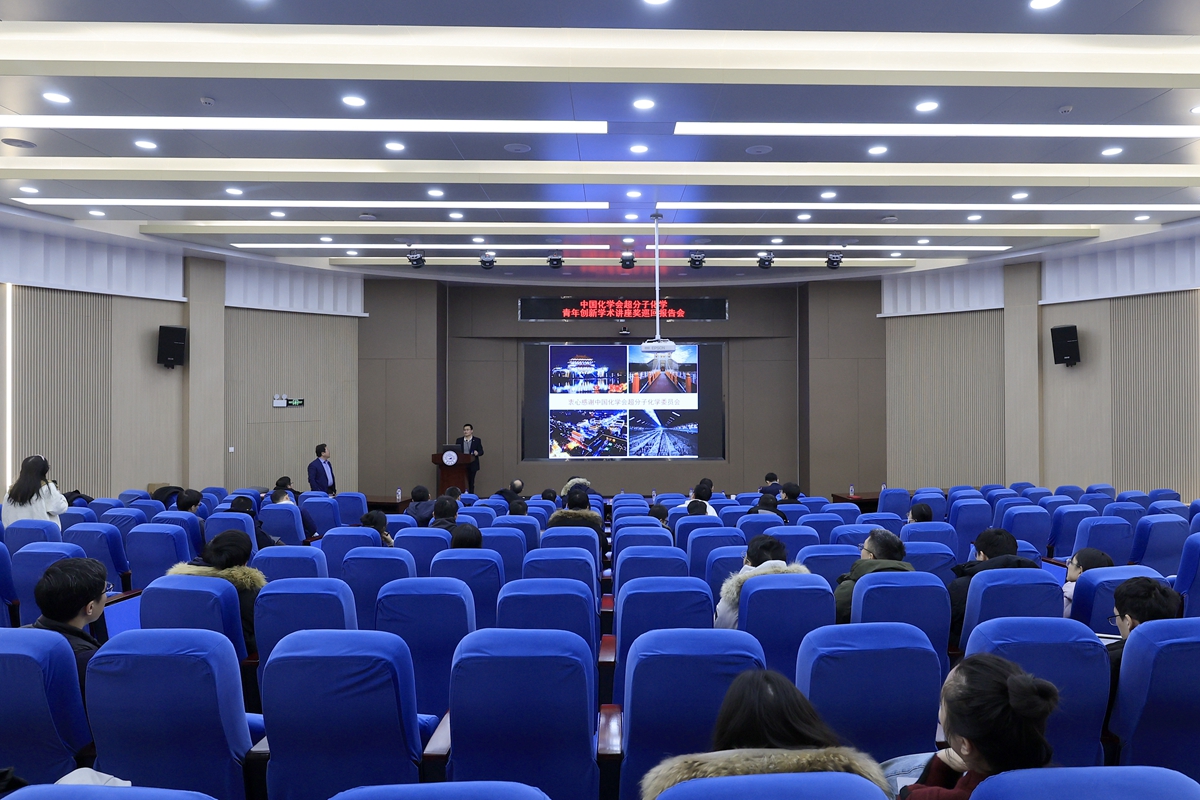 理化技术研究所丛欢研究员、上海交通大学颜徐州研究员颁奖。三位获奖者分别以《有机金属超分子化学》《共轭多环超分子》《机械互锁聚合物》为题作专题报告,并对师生提出的学术问题作了耐心、细致的解答。