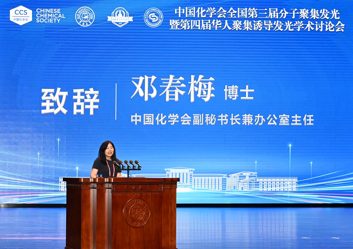 邓春梅在致辞中代表中国化学会向唐本忠教授及其带领的中国化学会分子聚集发光专业委员会成立以来在学术交流、人才培养和科普方面取得的显著成果表示感谢,向黑料正能量