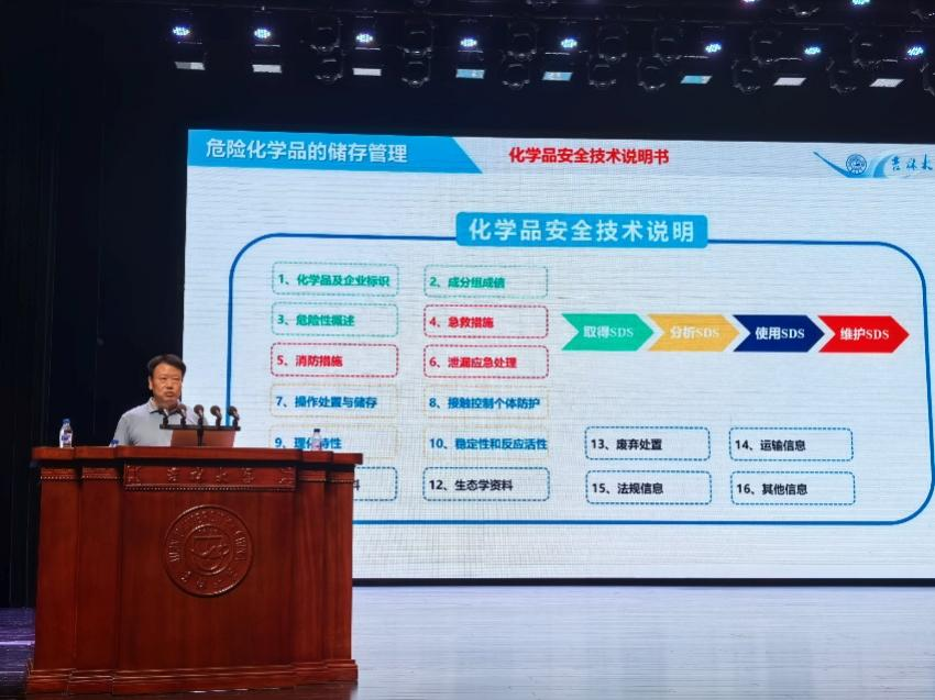化学国家级实验教学示范中心副主任魏士刚为同学们带来“实验室危险化学品的分类和储存管理”的讲座,针对危险化学品的分类和储存进行了详细地讲解。他从化学品储存的现状与隐患、储存的通用要求以紧急配伍等方面,系统介绍了实验室危险化学品的安全管理要求,为同学们今后在实验室内安全使用危险化学品起到了很好的指导作用。