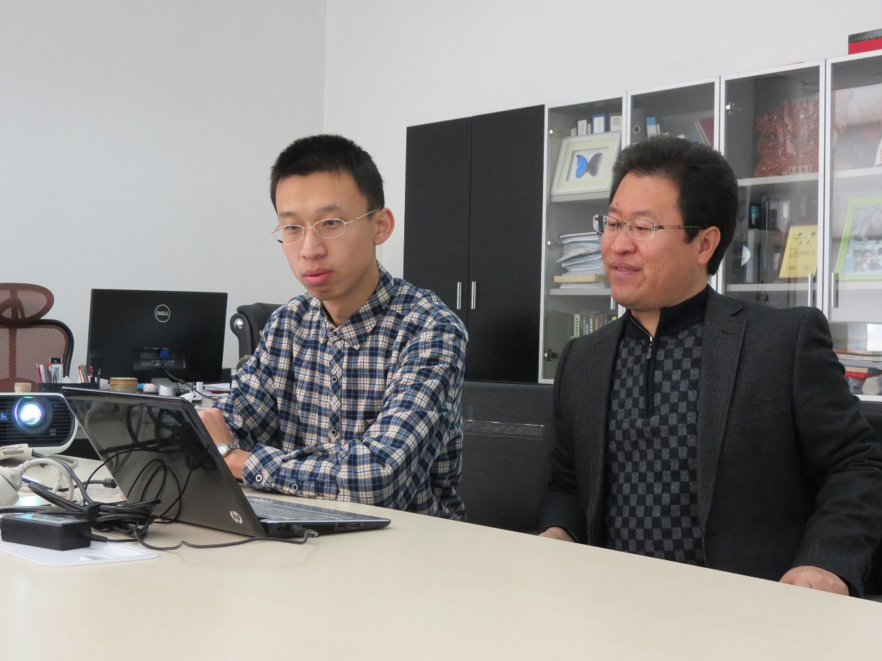 图9 2015年,我和研究生李天奇讨论可逆交联聚合物的工作。李天奇现为我课题组的助理教授