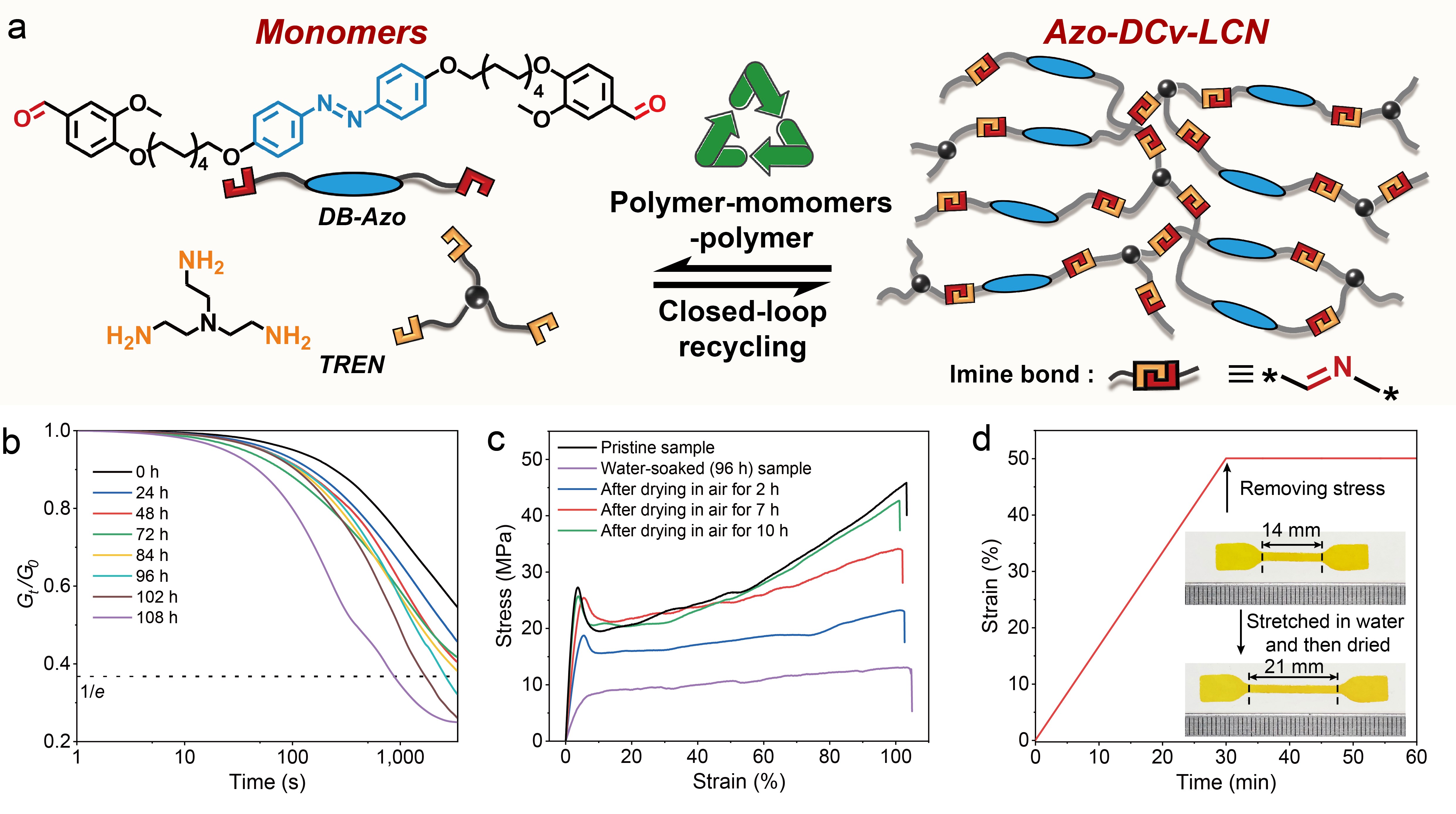 刘小孔教授课题组报道了可实现“聚合物到单体”闭环回收的室温编程动态液晶网络,并基于闭环回收实现了材料的彻底再生与液晶驱动器的功能更新。将含偶氮苯液晶基元的二苯甲醛单体(DB-Azo)与三胺单体(TREN)经席夫碱反应缩聚,制备得到了动态亚胺键作为交联点的Azo-DCv-LCN。利用亚胺键的水致动态性,Azo-DCv-LCN可通过水中浸泡后拉伸实现室温编程,获得光响应液晶驱动器。将驱动器的光驱动行为与聚合物网络的形状记忆性质相结合,实现了驱动器复杂化与多样化的形态操控。重要的是,利用亚胺键在酸催化下的水解特性,Azo-DCv-LCN可在室温下实现解聚和两个单体的分离与高效率、高纯度回收,回收的单体可用于制备全新的Azo-DCv-LCN,实现了材料的彻底再生与性能恢复。在回收再制备过程中,可方便地去除原填料并引入新的功能填料,不仅使驱动器彻底再生,同时实现了功能更新,对于液晶驱动器经济价值的循环与升级具有重要意义。该工作以题为“Closed-Loop Recyclable and Totally Renewable Liquid Crystal Networks with Room-Temperature Programmability and Reconfigurable Functionalities”的文章发表于Angewandte Chemie International Edition上。