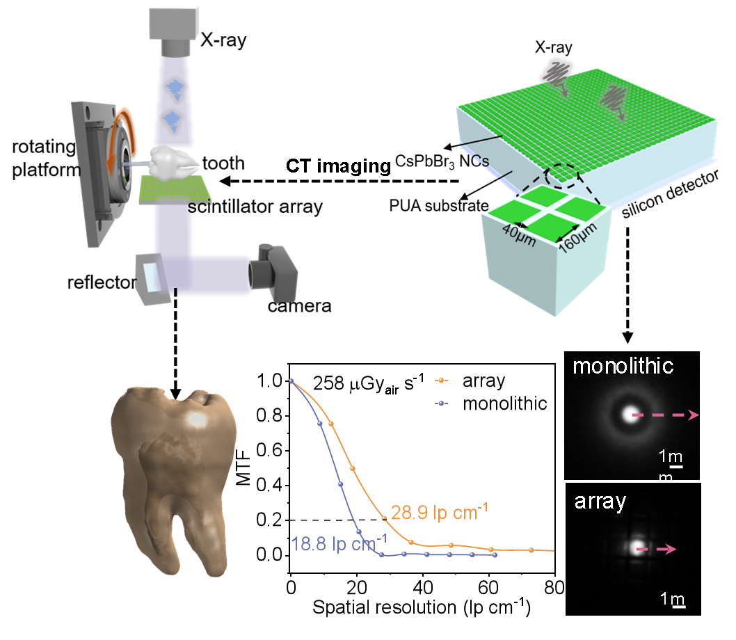 X射线计算机断层(Computed Tomography,简称CT)技术作为一种诊断成像技术,能够进一步无损地提供物体内部结构的三维(3D)信息,在现代医学影像技术中发挥着和关键作用。为了提高CT成像的分辨率和准确性,降低使用的X射线剂量以减少患者的辐射暴露风险,需要开发满足成像要求的阵列探测器。大多商用医疗CT设备使用像素化的闪烁体探测器,传统的无机和陶瓷闪烁体,通过在表面图案化的模板中沉积/回填,或通过外部包覆低折射率的结构基质来形成阵列衍生的结构化闪烁体。然而,传统闪烁体的合成温度过高(约1700℃)、结构和形状的不灵活性以及形成阵列需要的复杂光刻工艺仍成为需要改进的因素。近年来金属卤化物钙钛矿闪烁体以其温和的合成条件、优异的X射线吸收能力、较高的相对光产率和纳秒级的衰减时间而备受关注,然而相关研究多局限于二维成像,关于三维CT成像的应用有待进一步研究。