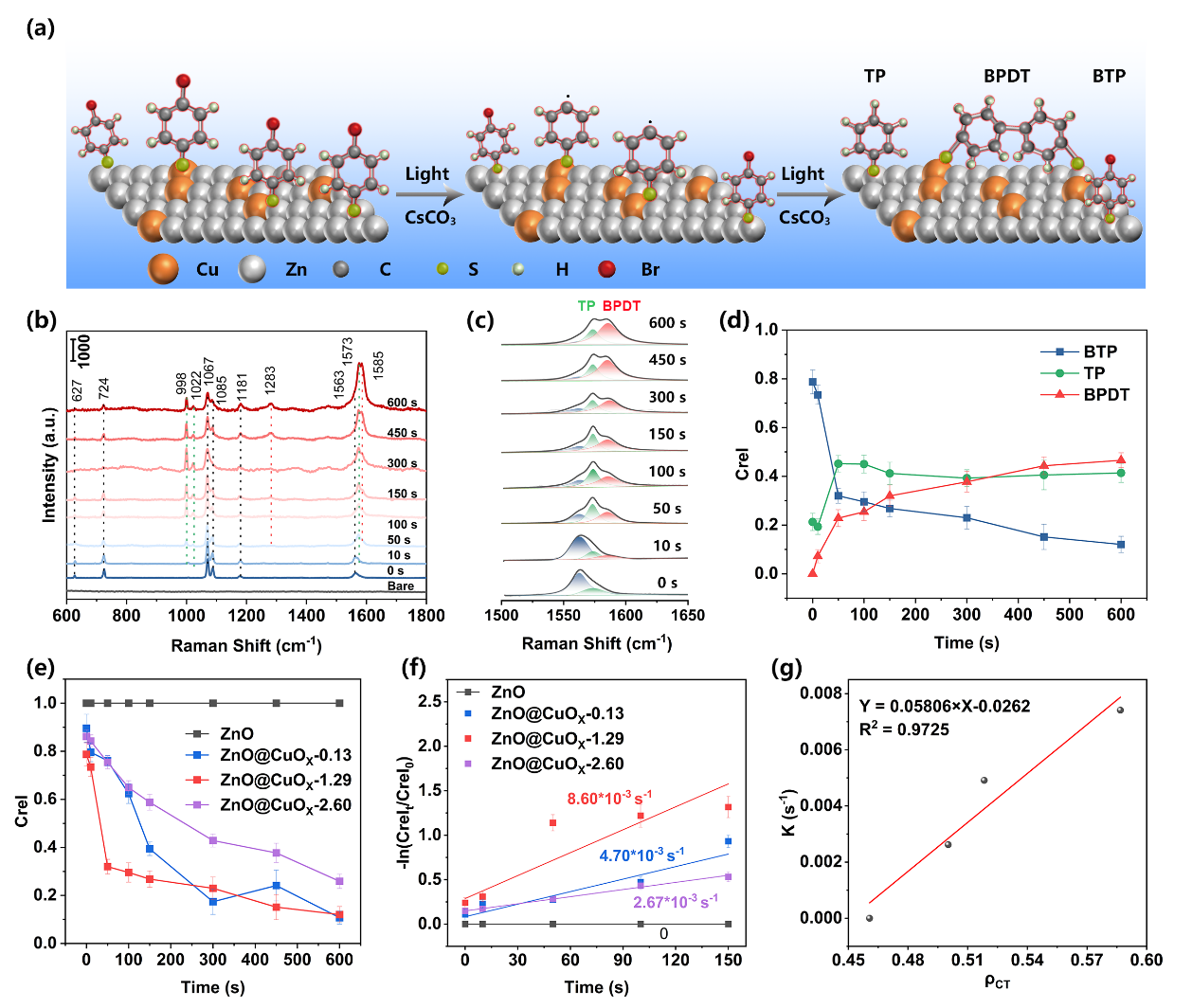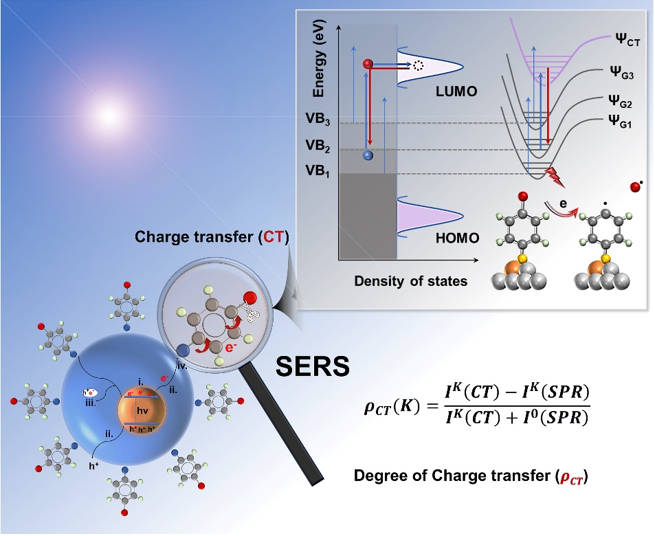 这项工作首次在纯半导体上通过原位SERS光谱直接监测到4-溴苯硫酚(BTP)的脱溴偶联和加氢反应。基于原位SERS光谱发现ZnO@CuOx-y上吸附BTP分子的光催化反应速率与基于SERS光谱计算得到的电荷转移度(ρCT)呈良好的线性相关关系,揭示了ρCT与催化活性之间的联系。多种光电实验和DFT计算共同表明不同含量铜离子掺杂可以通过调节半导体与表面吸附分子之间的ρCT进而调控SERS效应和催化活性。因此,作者提出可以利用基于CT的SERS光谱实现对半导体光催化活性的定量评估和有效预测,为研究光催化体系中界面CT提供了一种可供选择的、直观的分子光谱方法。此外,这一发现也在其他一系列半导体材料和催化反应体系中得到验证,证实了ρCT在预测和评估SERS和催化活性方面的广泛适用性。