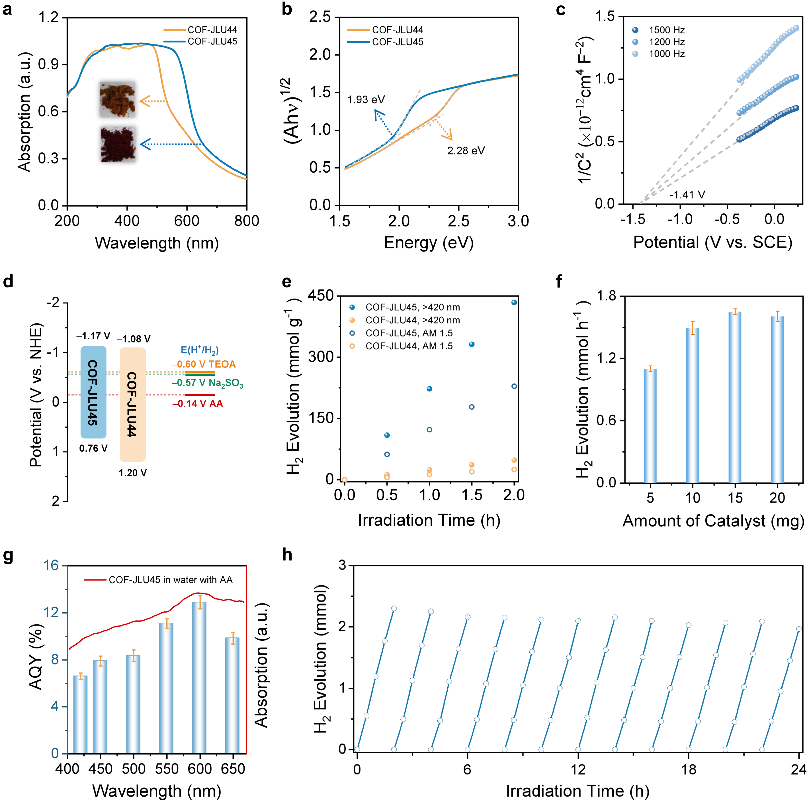 图3. COF-JLUs的能带结构与光解水产氢性能