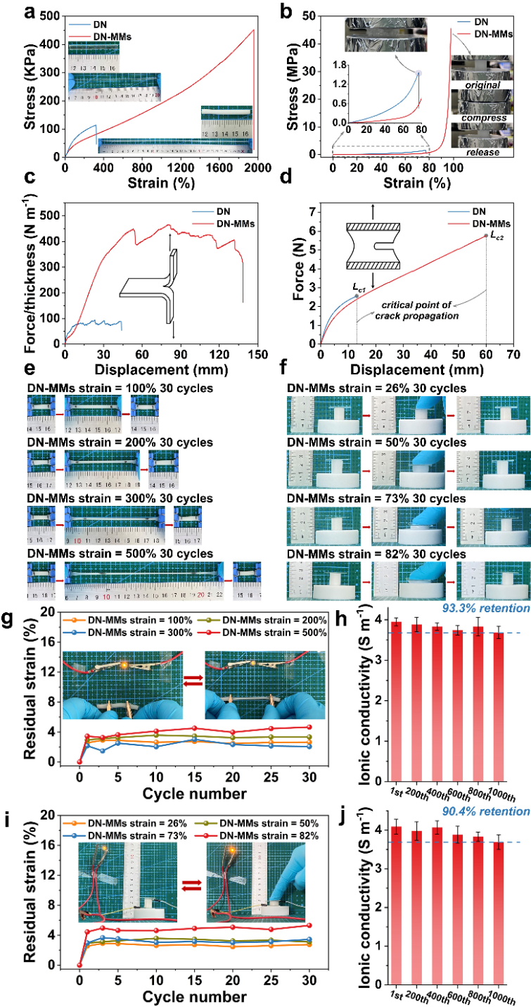 DN-MMs水凝胶电解质具有优异的拉伸性能,区别于传统的粘弹性材料,表现出类似于橡胶的弹性行为。同时DN-MMs水凝胶电解质可以承受近千次的循环拉伸而不会进一步产生疲劳损伤。