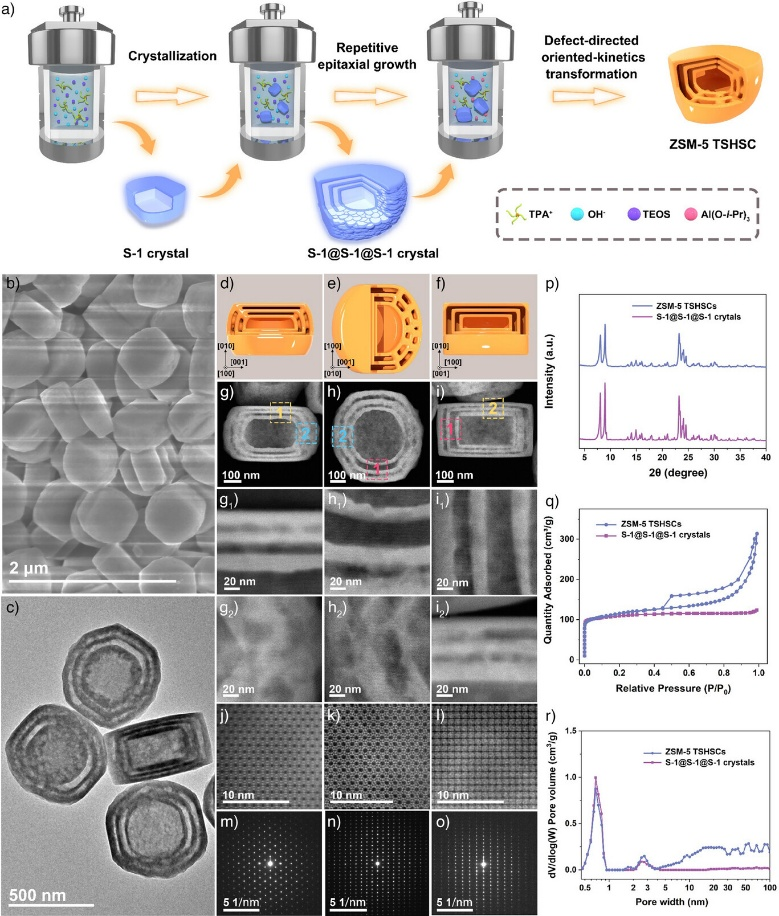 鉴于此,本研究提出了一种缺陷导向的定向动力学转化策略,成功制备出了单晶多层中空ZSM-5分子筛(图一)。首先,在纯硅分子筛(Silicalite-1)内核表面连续逐层外延生长,得到具有梯度缺陷分布的外壳。由于分子筛晶体不同取向的生长速率差异,形成了梯度的层状缺陷和离散的岛状缺陷。在碱性水热条件下,缺陷密集区域优先被刻蚀形成介孔或空腔。同时,有机结构导向剂诱导硅铝物种发生重结晶,使得纳米壳层间相互连接,维持了单晶结构(图二)。