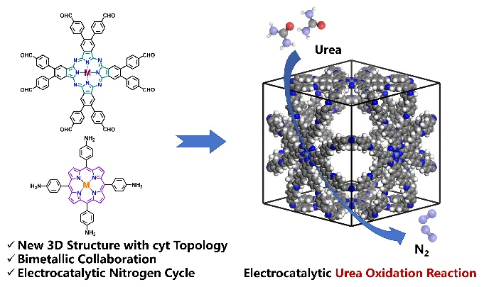针对上述科学问题,金恩泉教授研究团队开发了一系列具有cyt拓扑结构、基于卟啉和酞菁单元的三维(3D)COFs材料。该类COFs成功构建了一个双金属催化体系,其特点是:在由Por和Pc单元构成的高度稳定且共轭的空间网络中,不同种类的金属原子有序地配位于Por和Pc核心上。同时,这些双金属活性位点之间存在的协同效应,使其在尿素氧化反应(UOR)中表现出优异的性能,如高导电性、高稳定性及相对于可逆氢电极(RHE)仅为1.37 V的超低起始电位等。通过理论计算,进一步阐明了该类双金属COFs在协同催化过程中的分子机制。与2D类似物和非晶态材料相比,具有更多可及活性位点的这类Por-Pc-COFs能够充分利用其三维有序网络的结构优势,有望成为实现高效光催化、电催化性能的理想平台。