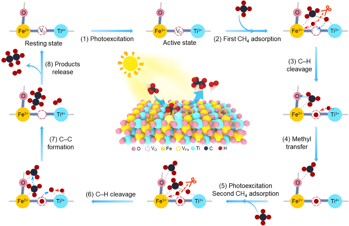 长春应用化学研究所宋术岩研究员团队提出了一种创新性的催化剂设计策略:在具有高活性{012}晶面的缺陷钛铁矿(Fe1-xTiO3-x-NS)上构筑受阻Fe2+–□–Ti4+双金属位点。该双金属位点与相邻晶格氧协同作用,使催化体系在无氧条件下实现了高效且选择性的光催化甲烷转化,对C2+产物的选择性接近100%,并表现出优异的循环稳定性与出色的抗积碳能力。值得强调的是,该体系的催化性能已超越当前文献报道的金属氧化物及贵金属基光催化剂,展现出优异的应用潜力。机理研究揭示,催化剂的价带主要由Fe离子占据,光生空穴富集在Fe位点;导带则主要由Ti离子占据,能够有效地接收光生电子。光照下,受阻Fe2+–□–Ti4+位点可被激发形成具有长寿命的Fe3+–□–Ti3+活性态,而表面晶格氧在多步反应中起到稳定反应中间体的关键作用。这种协同效应显著降低了C–H键的活化能,优化了甲基迁移与偶联路径,降低了C–C键生成能垒,并有效抑制了甲基中间体的过度脱氢。该双金属–氧协同策略成功打破了传统催化体系中活性与选择性之间的权衡,实现了卓越的催化性能与选择性协同提升。