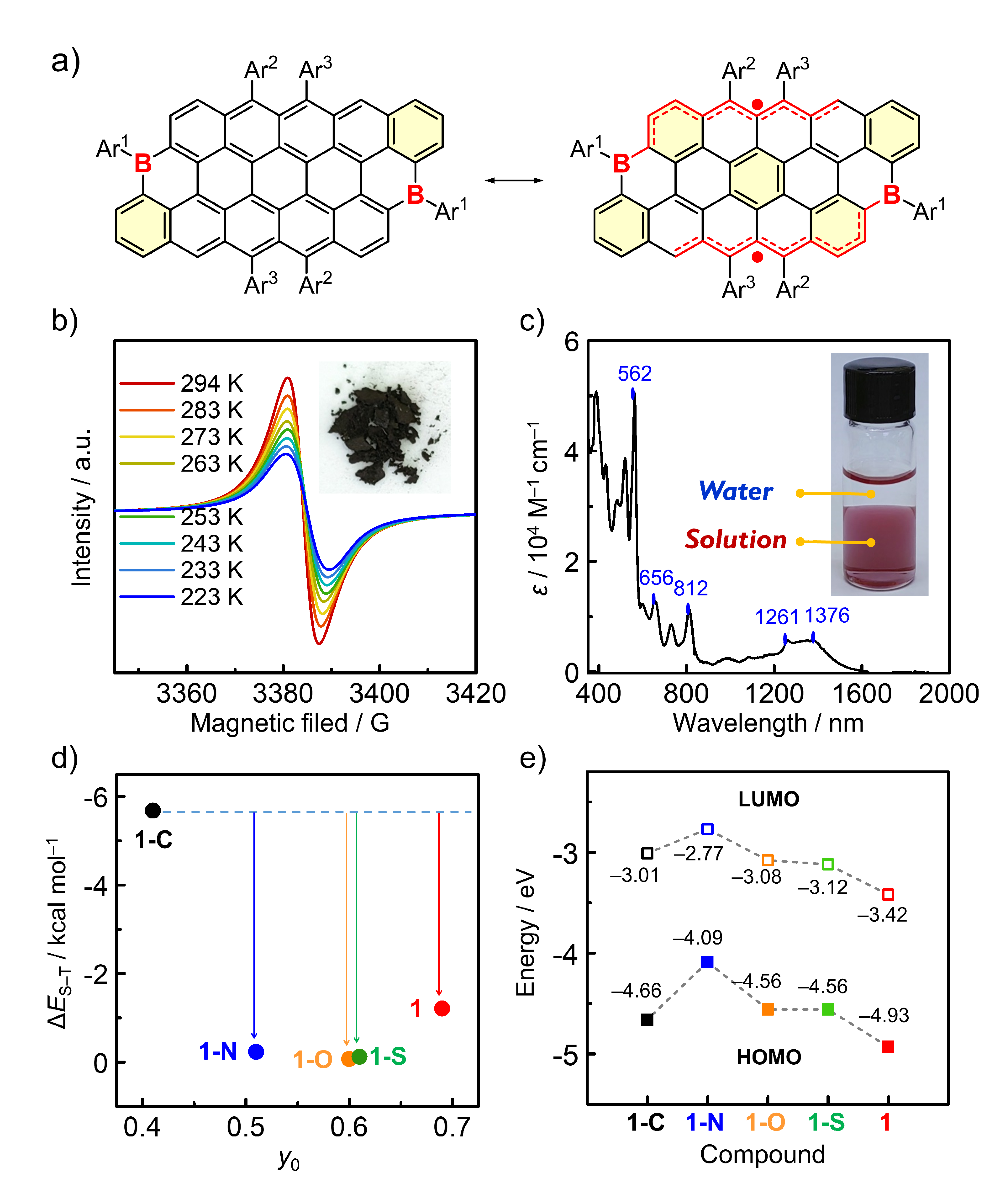图3.(a)1a的闭壳-开壳共振结构;(b)固态变温ESR图;(c)吸收光谱及溶液照片;(d,e)全碳和杂化衍生物的开壳参数和能级结构