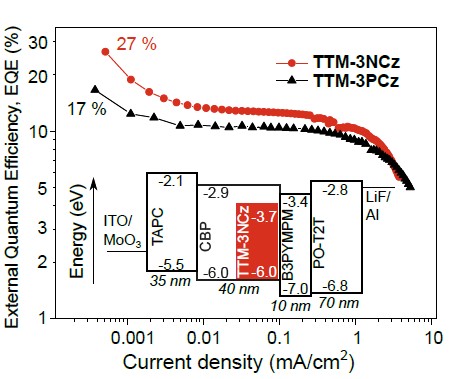 图3 基于TTM-3NCz、TTM-3PCz的OLED的能级结构以及EQE曲线