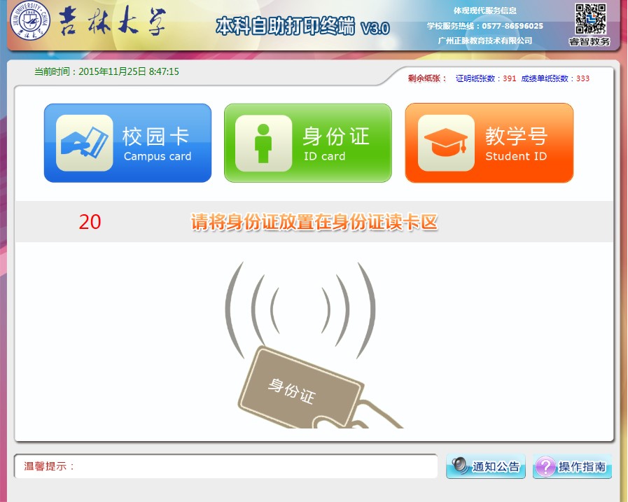 (2)证明文件打印:在学证明只对在校学生提供打印,毕业证明和学历证明只对毕业生提供打印,证明纸张低于临界值时,系统自动禁止提供打印服务,并自动短信提醒管理人员添加纸张。