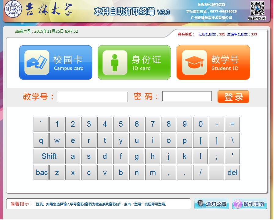 (1)成绩单打印:全校在读本科生都可打印。成绩单纸张低于临界值时,系统自动禁止提供打印服务,并自动短信提醒管理人员添加纸张。