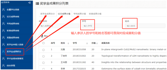 研究生师生信息综合库”(//one.heiliaobase.com/),在【奖学金成果积分】栏进行查询(见下图说明)。
