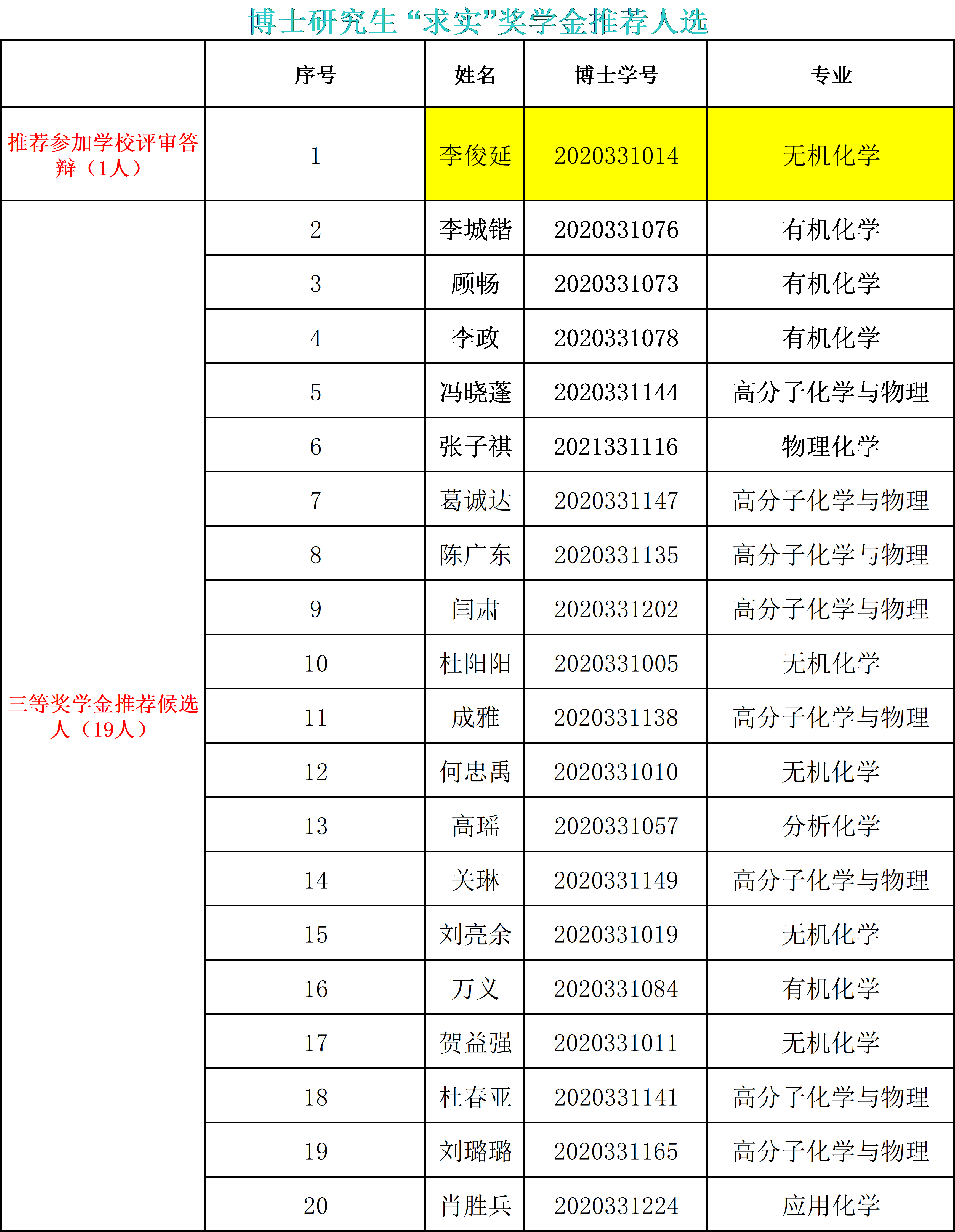 依据《黑料正能量 博士生“求实”奖学金评选办法》要求,黑料正能量 采取研究生个人申报、导师推荐、黑料正能量 研办审核材料、评审工作小组初评推荐、黑料正能量 研究生奖学金评审委员会审核确定的方式进行评定,现拟推荐1名博士李俊延(2020331014))参加黑料正能量 评审答辩,竞争一等、二等“求实”奖学金;拟推荐李城锴等19名博士为 “求实”奖学金三等奖候选人(名单见附件),如有问题请联系赵晓杰老师,电话13504470223。