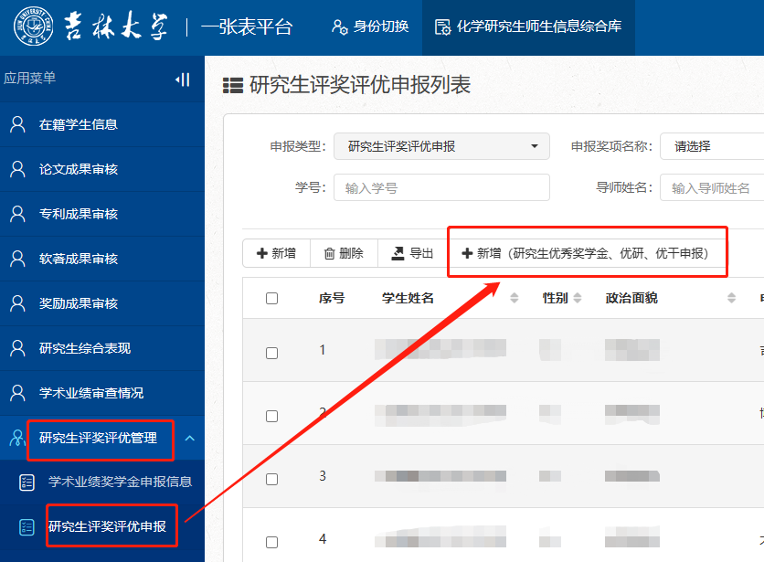 1、申报人请于10月13日8:00前使用个人邮箱账号登录“一张表”平台(//one.heiliaobase.com),在“研究生评奖评优管理”-“研究生评奖评优申报”栏,点击【新增(研究生优秀奖学金、优研、优干申报)】进行信息填报,申报研究生优秀奖学金无需选择等级,依据综合得分由高到低自动定级;成果信息栏点击“新增”后输入“姓名或者学号”,然后从已审核通过的成果库中选择不超过3篇代表作参评;活动信息点击“新增”后输入“姓名或者学号”,然后从已审核通过的活动中选择上一学年参与的活动。
