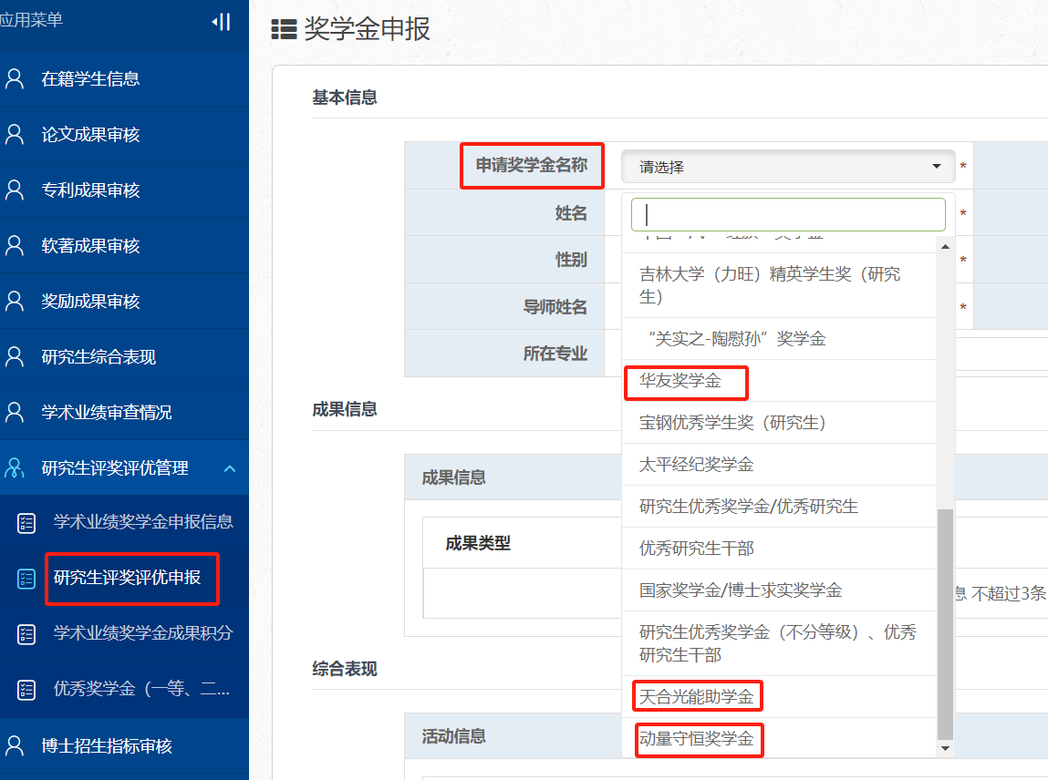 (1)申报人于11月30日12:00前使用个人邮箱账号登录“一张表”平台(//one.heiliaobase.com),在“研究生评奖评优管理”-“研究生评奖评优申报”栏,点击【新增】进行【天合光能助学金】信息填报,同时扫码加入申报微信群。