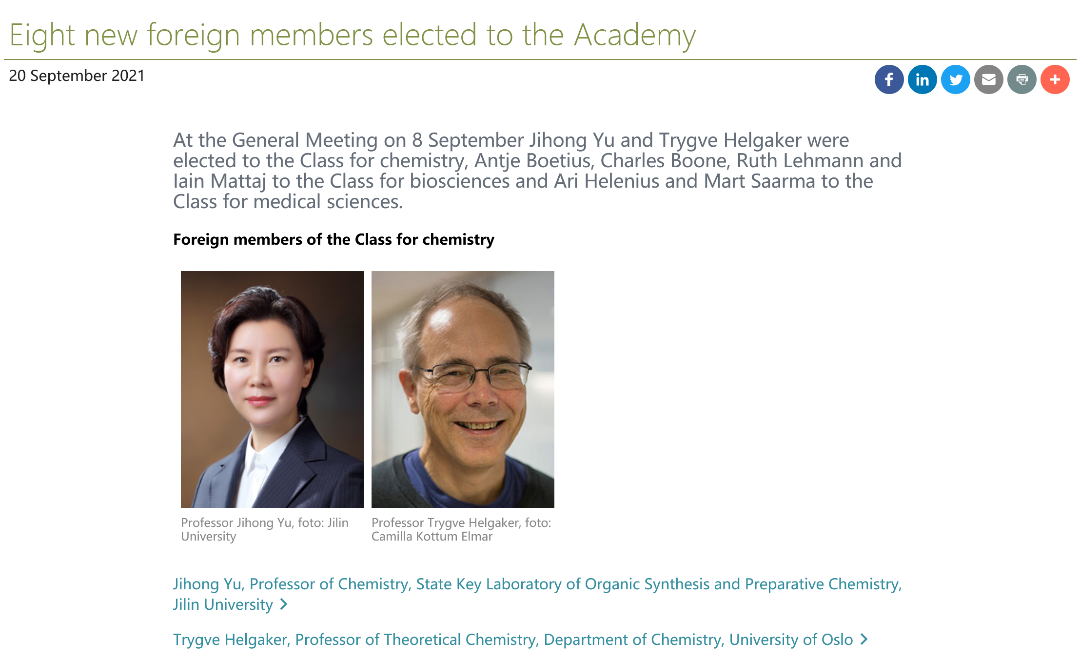 本次新增8位外籍院士,其中化学学科新增2位。目前,化学学科外籍院士共计16位,于吉红教授是其中唯一一位中国科学家。