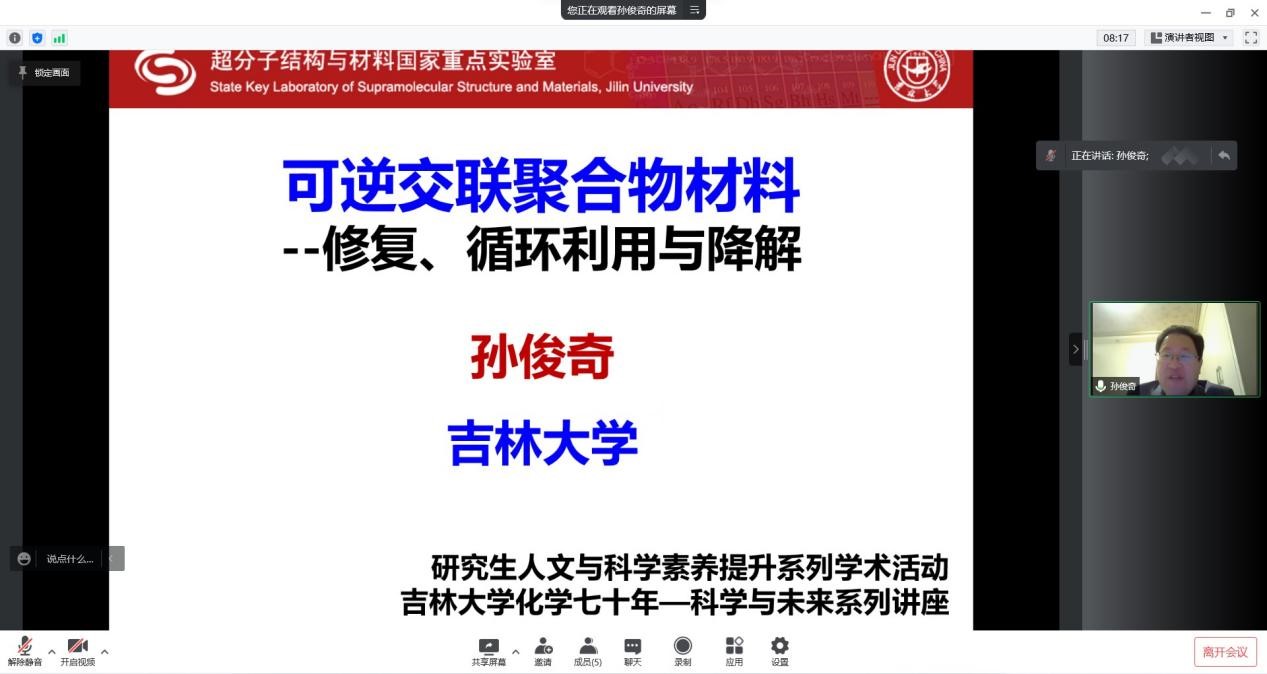 化学70年院庆系列活动—科学与未来系列讲座”,本期讲座邀请了孙俊奇教授作主题为“可逆交联聚合物材料:修复、循环利用与降解”的线上学术报告。
