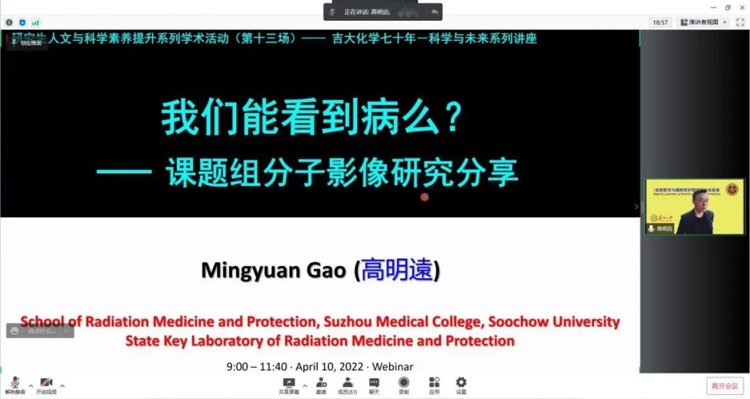 首先,高明远教授从光学成像、光声成像、磁共振成像、上转换/磁共振成像几个角度为同学们介绍了分子影像学的起源以及目前分子影像学研究的主要方法。同时,高明远教授也在讲座中与同学们分享了他的团队围绕“无创看到病”开展的一系列关于肿瘤、软组织疾病分子成像的研究收获,在工作中发展了新型高质量纳米氧化铁磁共振对比剂的制备路线,推动了其临床转化进程;利用纳米材料优异的本征物理特性,提出了诊疗一体化纳米探针的新构建策略以降低其临床转化风险;发展了多种病生理相关分子的活体定量可视化方法。