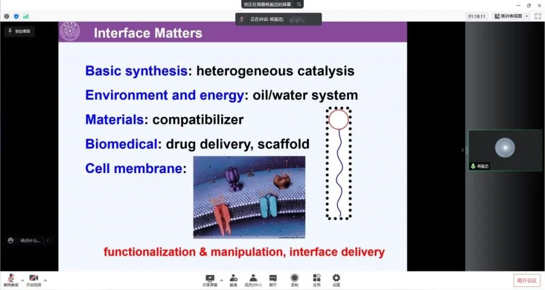随后,杨振忠教授结合个人经历,给同学们分享了他在毕业后确定研究方向、开拓研究领域、实现整链条科研——从实验模型到实际应用的励志故事。杨振忠教授团队发明的微胶囊应用广泛,可以应用到酶催化、能源、环境、生物医用、机械操控等众多领域,极具普适性,极大程度地促进了多领域交叉融合。