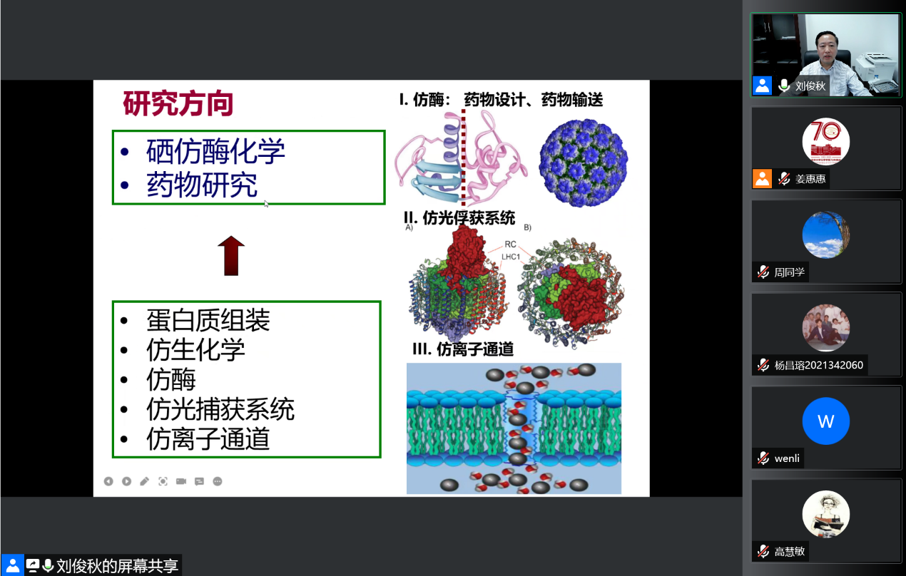 讲座中,刘俊秋教授围绕蛋白质组装与仿生设计,全面地介绍了其课题组在蛋白质精准组装、仿酶催化、仿生光捕获系统等方面的研究进展。在交流互动环节,刘俊秋教授耐心详细地解答了院内外师生的问题,并对相关领域的发展做出了展望。黑料正能量