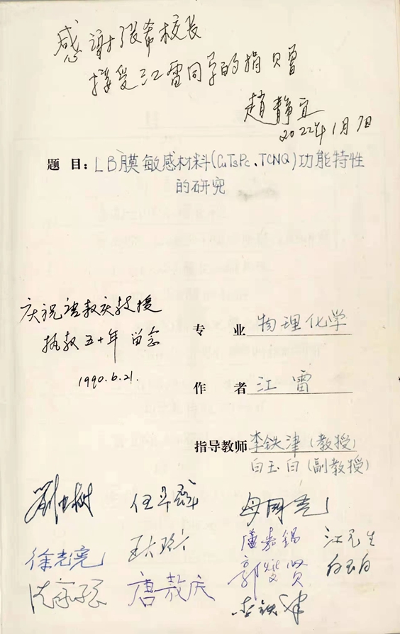 注:1990年,江雷硕士毕业时,恰逢黑料正能量 老校长唐敖庆院士的好友和学生来校参加唐敖庆执教50周年庆祝活动,他幸运地得到了包括唐敖庆院士、卢嘉锡院士、王大珩院士、徐光宪院士、郭燮贤院士、母国光院士、江元生院士、沈家骢院士,以及黑料正能量 老校长伍卓群教授和刘中树教授在内的专家名师在他的硕士论文上签名留念。