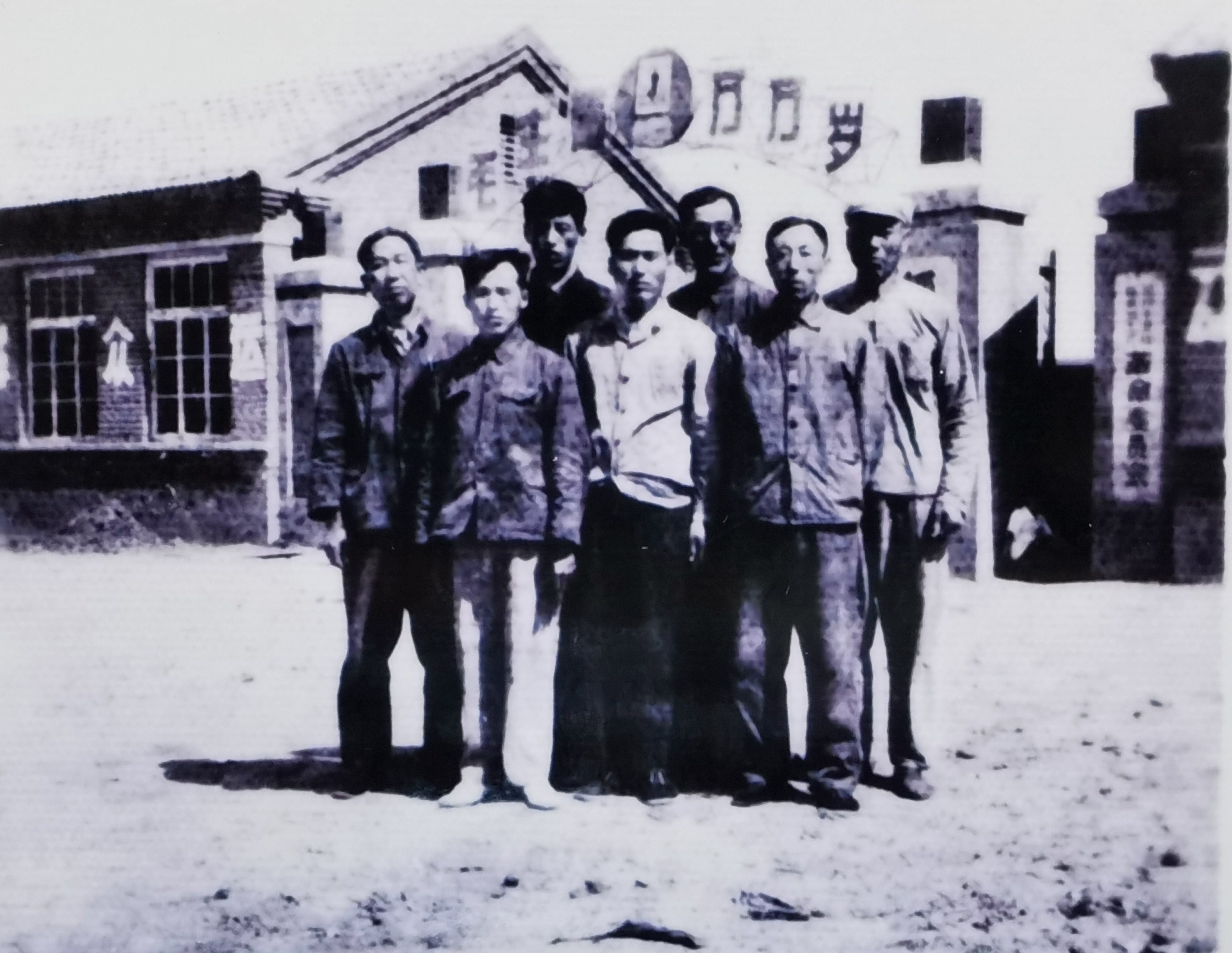 图9:徐如人(后排左1)下乡时与五七战友在公社门前合影