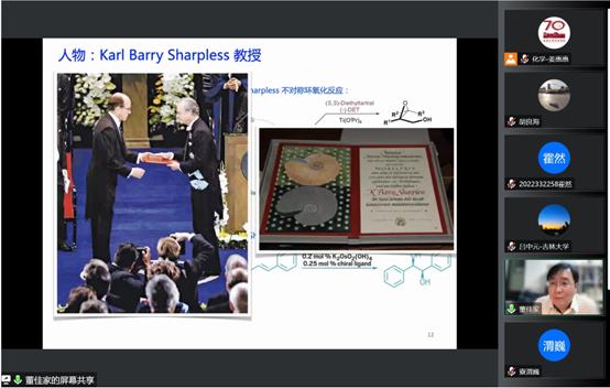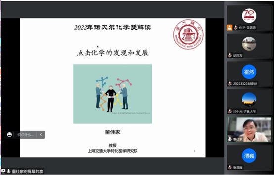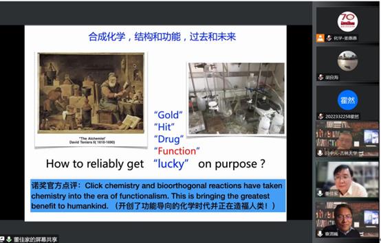 讲座中,董佳家教授围绕点击化学的发现和发展,深入浅出且幽默诙谐地介绍了 “点击化学”——模块化连接砌块分子,实现分子功能的理论本质,并对其开创了功能导向的化学时代进行了详细解读。同时分享了K. Barry Sharpless教授乐于学习、善于发现、勇于探索的科学精神以及Sharpless教授生活工作中的一些有趣的小故事。随后,董佳家教授激励广大学子,希望当代青年学者能够学习发扬老一辈化学家的科学精神,内化于心,外化于行,勇攀学术高峰。在交流互动环节,董佳家教授耐心详细地解答了院内外师生的问题,并对点击化学领域的发展做出了展望,黑料正能量