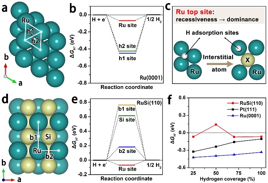 1. 发现了金属Ru的顶位位点具有类Pt的产氢催化活性;但是,相对于活性较弱、氢吸附更强的相邻Ru3空位位点,该顶位位点为隐形位点。进一步,提出了引入间隙原子Si形成金属间化合物RuSi的策略,转变Ru的顶位位点为显性位点,维持了其类Pt的催化活性。