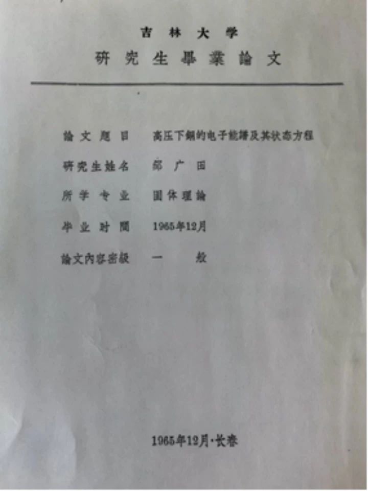 我对100和410万大气压下铜的3d电子密度分布计算表明,3d壳层发生了很大畸变,但是壳层还没有破裂。3d电子壳层之间的排斥势,要计算各种双中心积分,工作量很大,硬是靠手摇计算器,整整摇了两年,期间还有五年级同学做毕业论文,帮我做了一些计算。这些工作是芶先生受钱学森先生委托,与当时的尖端科学需要相结合,而提出的高压固体和高温气体研究工作的一部分。我于1965年12月通过论文答辩,研究生毕业。芶先生领导进行的这些工作是在世界计算物理学科诞生之前,中国科学界率先进行的大胆尝试。经过三年半的苦读与苦干,使我彻底坐住了板凳,学会了怎样进行创新性的科学研究,如何从国家重大需求出发来选取研究题目,也使我更热爱理论研究。