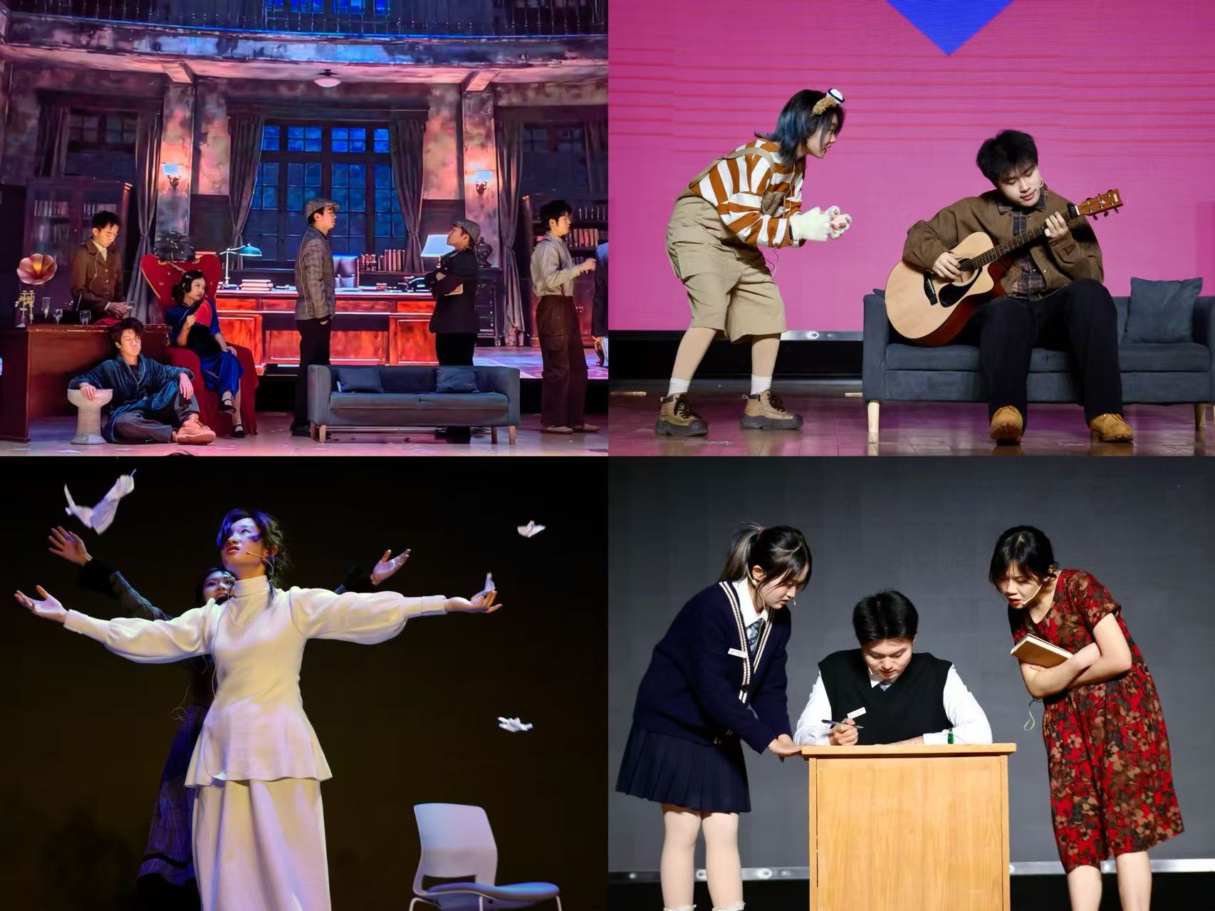 的50余名学生共同创作与演出。作品涵盖情感、成长与自我管理等多重维度,以舞台为镜,生动映照出大学生活的现实状况与内心图景,既捕捉日常中的欢笑与困扰,也传递出在自省与表达中寻找成长、凝聚共情的涵义。