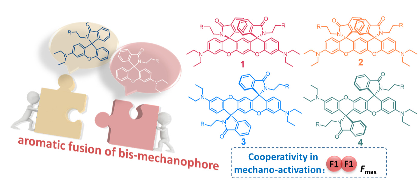 生命体中很多重要生理功能的实现与机械力传导和机械能转换密切相关。例如,作为机械门控离子通道的一员,Piezo1在各种生理和病理过程中发挥着关键作用,其高机械灵敏度得益于Piezo蛋白特定的三维结构,产生类似杠杆的、协同的机械传导机制。在合成高分子材料方面,近年来很多机械力响应的高分子被报道,研究者们将功能性的、相对较弱的基团(力敏基团,mechanophore)引入到高分子主链中心,当有足够大的机械力传到这些基团上时,便能诱导其发生化学反应,产生特定的功能。其中,由于光学信号易于表征,可用于特定化学键断裂的可视化及量化,实现应力指示,因而能产生具有可视化光学信号的力诱导变色和发光高分子引起了越来越多的关注。但由于高分子力化学反应的复杂性,通常存在转化率低,可提供的光学和受力信息有限的问题,因此模拟生物大分子的协同机械传感机制,发展新型的机械力诱导变色/发光高分子体系,从分子水平实现力响应基团(低力阈值)的协同化学反应及灵敏变色具有重要意义。但是由于将两个或多个反应位点引入到高分子链中时,它们通常经历逐级断键过程,且由于能量分散,其力阈值表现出比单个反应位点更高的力化学反应特征,或者经历一个被活化,另一个缺失力化学反应活性的特点,所以目前具有协同断键特性的力响应基团非常有限。