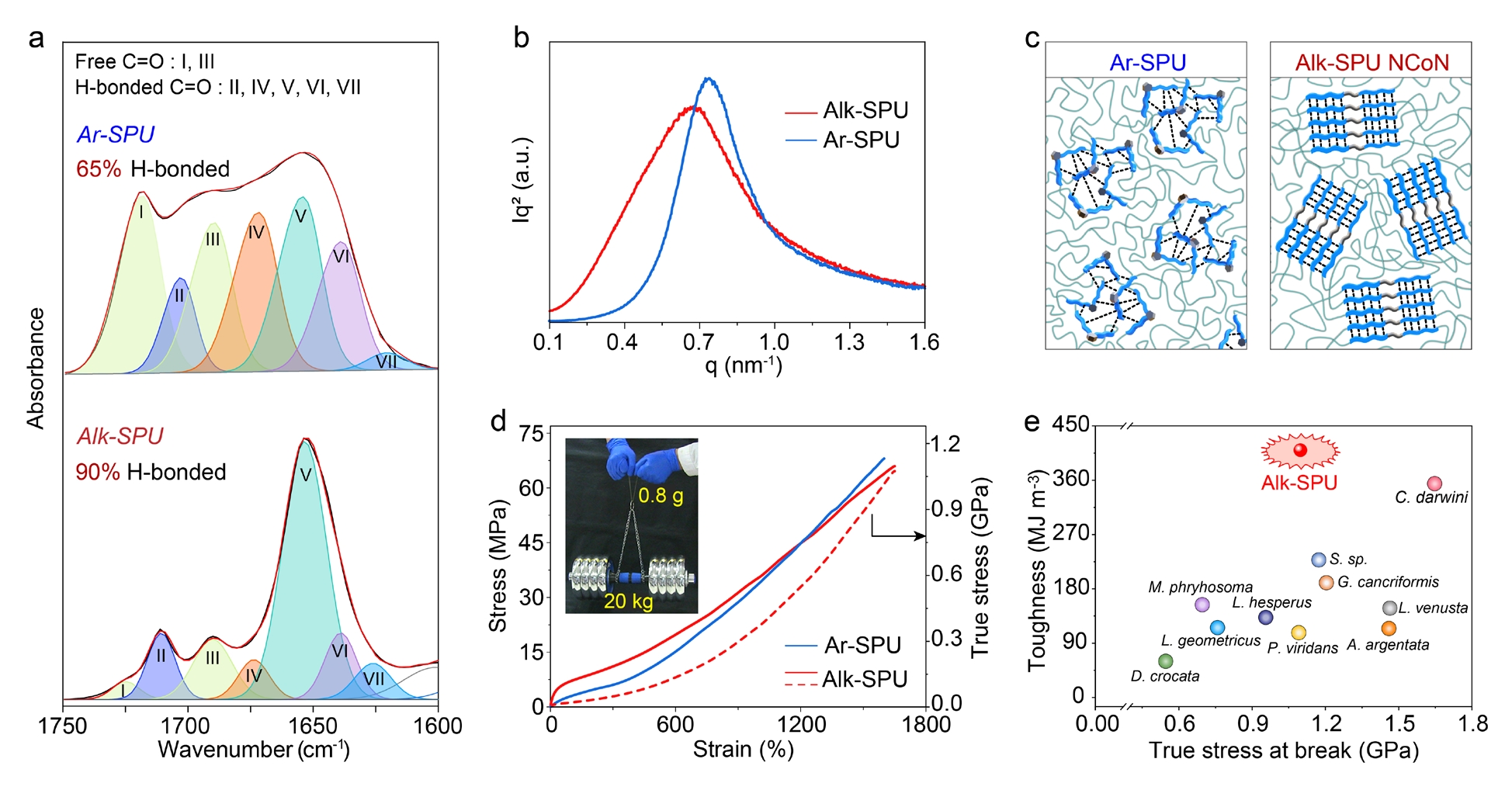 作者借助密度泛函理论、全原子模拟、傅里叶变换红外光谱和小角x射线散射等手段分析了两种SPNs的结构和氢键的形成情况,结果表明:由于空间位阻大,Ar-SPU硬段形成的氢键数目较少、平均键能较低;Alk-(ASCZ-U)2硬段因高柔顺性形成了数目更多、平均键能更大的氢键。这些氢键紧密聚集成氢键阵列,形成了NCoN,显著增强了氢键的多重协同性。Alk-SPU具有卓越的力学性能,其真实断裂应力高达1.1 GPa,与典型蛛丝(0.8~1.5 GPa)相当,其断裂韧性高达405.5 MJ m-3,超越了韧性最大的蜘蛛丝。