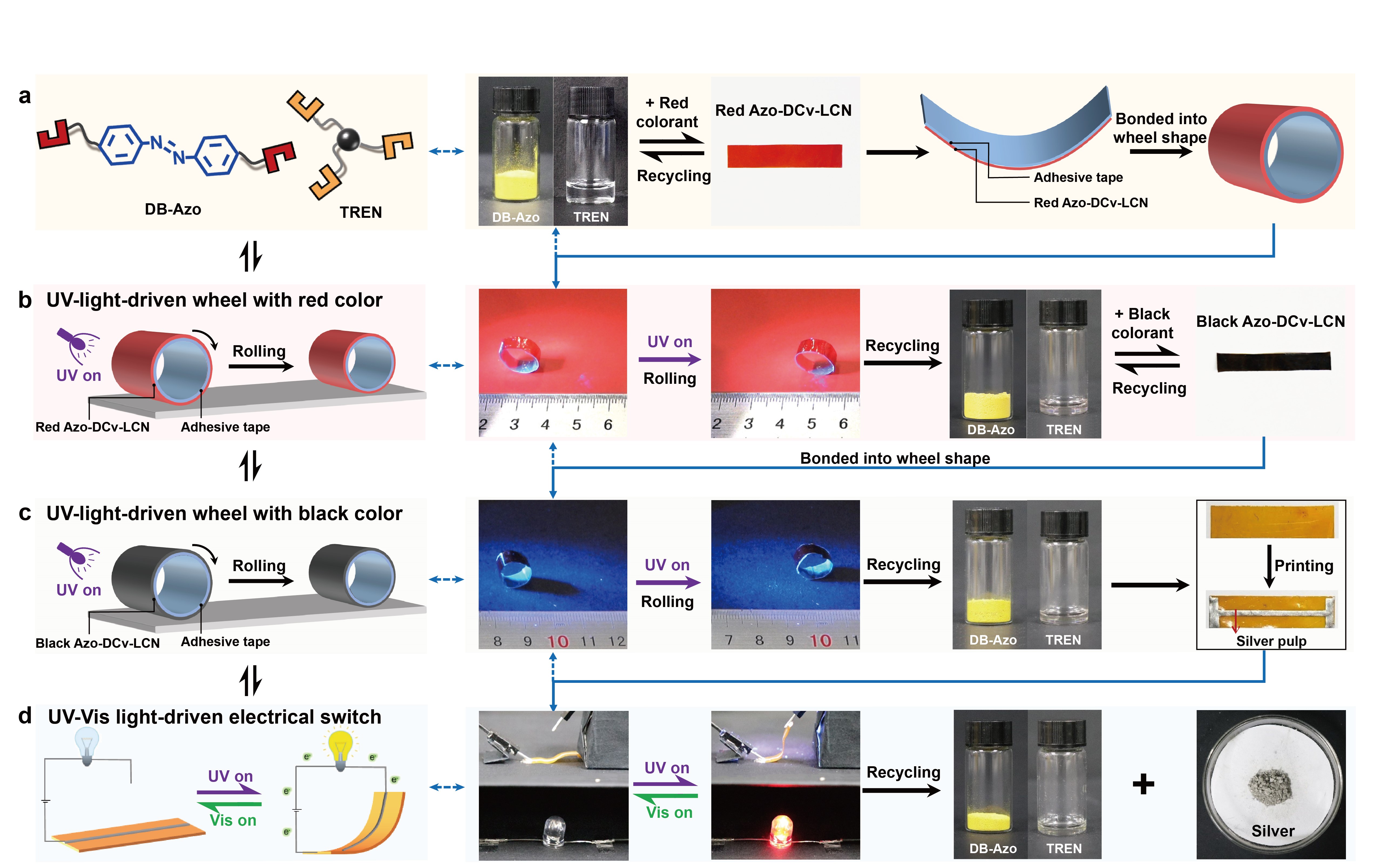 刘小孔教授课题组报道了可实现“聚合物到单体”闭环回收的室温编程动态液晶网络,并基于闭环回收实现了材料的彻底再生与液晶驱动器的功能更新。将含偶氮苯液晶基元的二苯甲醛单体(DB-Azo)与三胺单体(TREN)经席夫碱反应缩聚,制备得到了动态亚胺键作为交联点的Azo-DCv-LCN。利用亚胺键的水致动态性,Azo-DCv-LCN可通过水中浸泡后拉伸实现室温编程,获得光响应液晶驱动器。将驱动器的光驱动行为与聚合物网络的形状记忆性质相结合,实现了驱动器复杂化与多样化的形态操控。重要的是,利用亚胺键在酸催化下的水解特性,Azo-DCv-LCN可在室温下实现解聚和两个单体的分离与高效率、高纯度回收,回收的单体可用于制备全新的Azo-DCv-LCN,实现了材料的彻底再生与性能恢复。在回收再制备过程中,可方便地去除原填料并引入新的功能填料,不仅使驱动器彻底再生,同时实现了功能更新,对于液晶驱动器经济价值的循环与升级具有重要意义。该工作以题为“Closed-Loop Recyclable and Totally Renewable Liquid Crystal Networks with Room-Temperature Programmability and Reconfigurable Functionalities”的文章发表于Angewandte Chemie International Edition上。