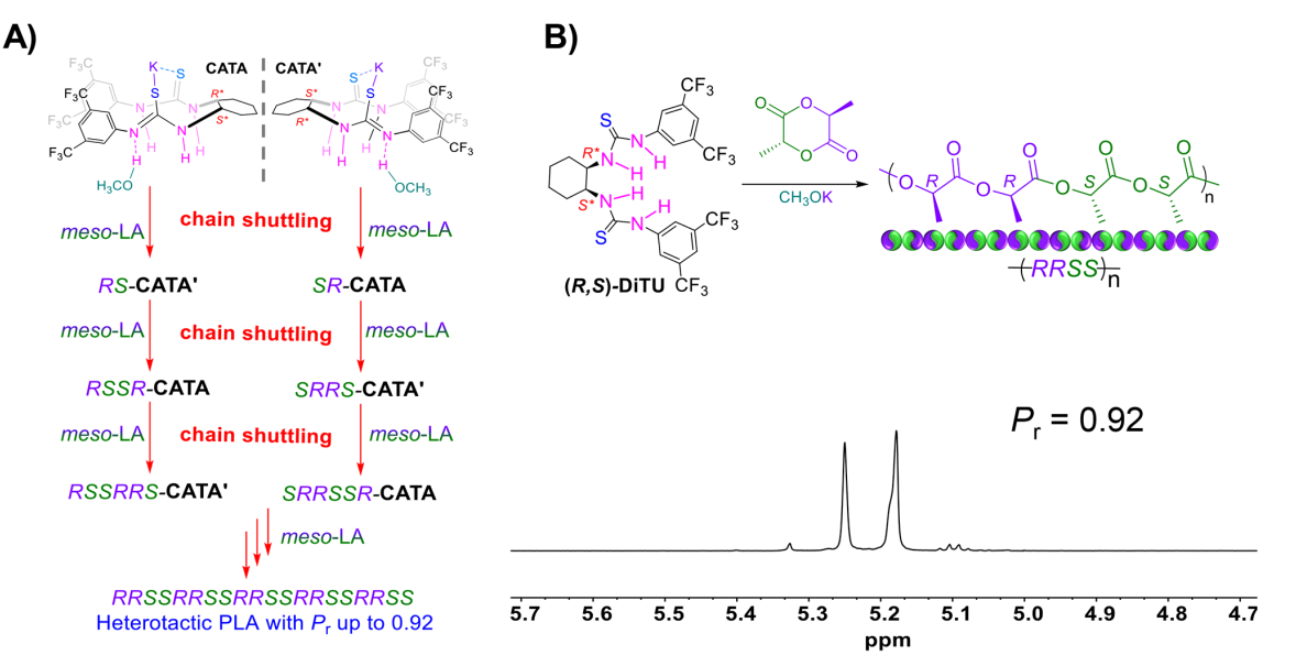 张越涛教授课题组合成了基于顺式环己二胺的双硫脲催化剂cis(R,S)-DiTU,与甲醇钾结合催化丙交酯的立体选择性聚合,双硫脲基团在钾桥的作用下相互靠近,可以在链末端手性识别和单体的立体选择性活性进行切换,实现了丙交酯的立体选择性聚合,合成了等规和杂同等规聚乳酸。