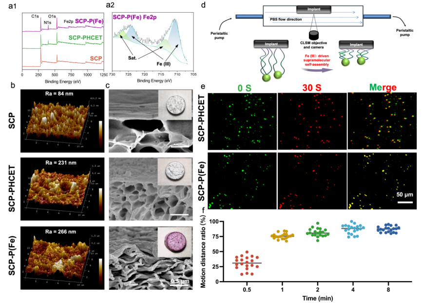 第一医院骨科中心-创伤骨科,设计并研发了一种碳纤维增强聚醚醚酮基(CF/PEEK)复合材料植入物的智能表面,该表面可根据患者自身情况定制骨修复进程,植入后自主实现多重内源性调节。智能超分子修饰策略利用具有三吡啶官能团的单体和N-羟乙基丙烯酰胺,通过原位可逆加成-断裂链转移(RAFT)聚合反应在CF/PEEK复合材料植入物表面构建智能超分子层。随后,在分子末端修饰赖氨酸-精氨酸-丝氨酸-精氨酸(KRSR)的小分子肽,最后将阿仑膦酸盐(ALN)接枝到分子链上。植入后,植入物表面刷状大分子最初抵抗巨噬细胞黏附,从而降低免疫炎症的水平。随后,由于铁过载引起的Fe(III)介导的超分子自组装,分子链发生构象变化并转化为机械信号,通过分子末端的 KRSR 短肽的结合能力特异性地传递到成骨前体细胞,通过 YAP/β-catenin 信号轴诱导其向成骨方向分化。此外,成骨细胞分泌碱性磷酸酶(ALP),该酶具有水解磷酸酯键的功能,使ALN释放,这一过程进一步改善了局部骨质疏松微环境。