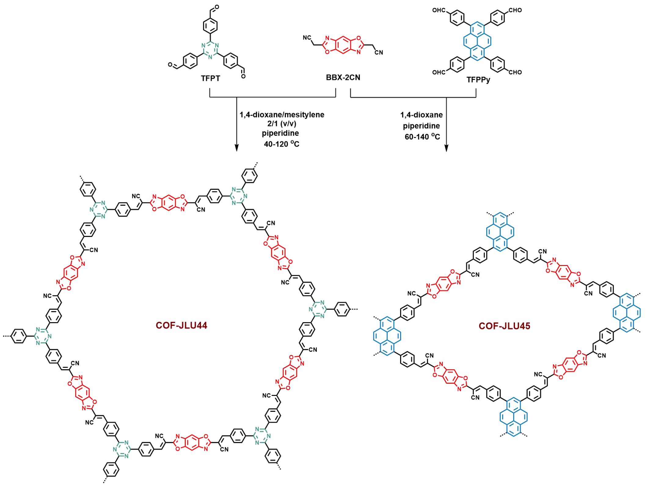 在课题组前期研究工作基础上,首次通过Knoevenagel缩聚反应成功构建了两个全共轭苯并双噁唑桥接的共价有机骨架材料(COF-JLU44和COF-JLU45)。在可见光照射(λ > 420 nm)下,COF-JLU45的产氢速率高达272.5 mmolg-1h-1,表观量子效率(AQY)在600 nm波长下达到12.9%,并具有良好的循环稳定性。该研究通过分子结构设计与实验-理论协同分析,揭示了高效电荷分离与激子解离的机制,为共价有机骨架基光催化剂的设计提供了新的灵感。