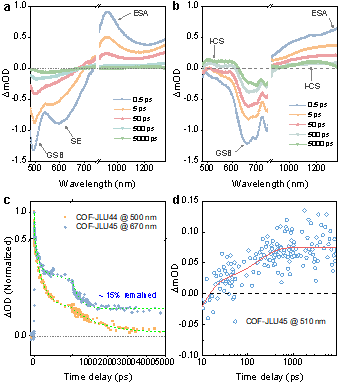 瞬态光电流测试显示,COF-JLU45的阴极光电流密度为6.7 μA cm-2,是COF-JLU44的2.68倍,直观反映了其优异的电荷分离动力学。此外,其激子结合能低至24.1 meV,使得激子可自发解离为自由电荷,极大提升了电荷利用率。在400 nm激光激发下,COF-JLU44的TA谱图显示两个漂白峰(GSB:~500 nm,SE:~610 nm)及宽范围的光诱导吸收(PIA:~930 nm),对应激子的生成与衰减过程。GSB和SE信号在5000 ps内迅速衰减至基线(图4a),表明其激子寿命较短(平均1.66 ns),且未检测到电荷分离态(i-CS)的生成。这种快速复合行为源于COF-JLU44的三嗪-苯并双噁唑结构中电子-空穴重叠积分较高,导致激子结合能较大,电荷难以有效解离。相比之下,COF-JLU45的TA动力学展现出显著差异(图4b-d)。激发初期(0.5 ps),其GSB信号位于~670 nm,伴随ESA信号在1350 nm处出现,表明激子的瞬时生成。随着时间延迟,ESA信号逐渐红移至1150 nm,并在510 nm处形成新的吸收峰(图4d),这一动态变化揭示了电荷分离态(i-CS)的逐步形成。值得注意的是,约15%的GSB信号在5000 ps后仍持续存在(图4c),表明COF-JLU45中存在长寿命的自由电荷载流子,其生成寿命经多指数拟合为105 ps(图4d)。