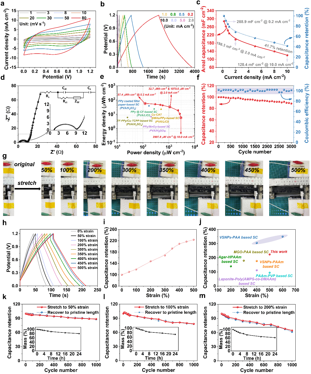 图5 基于DN-MMs水凝胶电解质的可逆拉伸柔性超级电容器的电化学性能