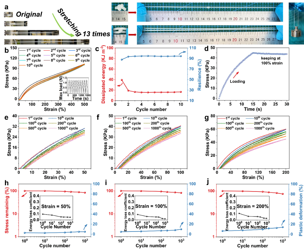 DN-MMs水凝胶电解质具有优异的拉伸性能,区别于传统的粘弹性材料,表现出类似于橡胶的弹性行为。同时DN-MMs水凝胶电解质可以承受近千次的循环拉伸而不会进一步产生疲劳损伤。