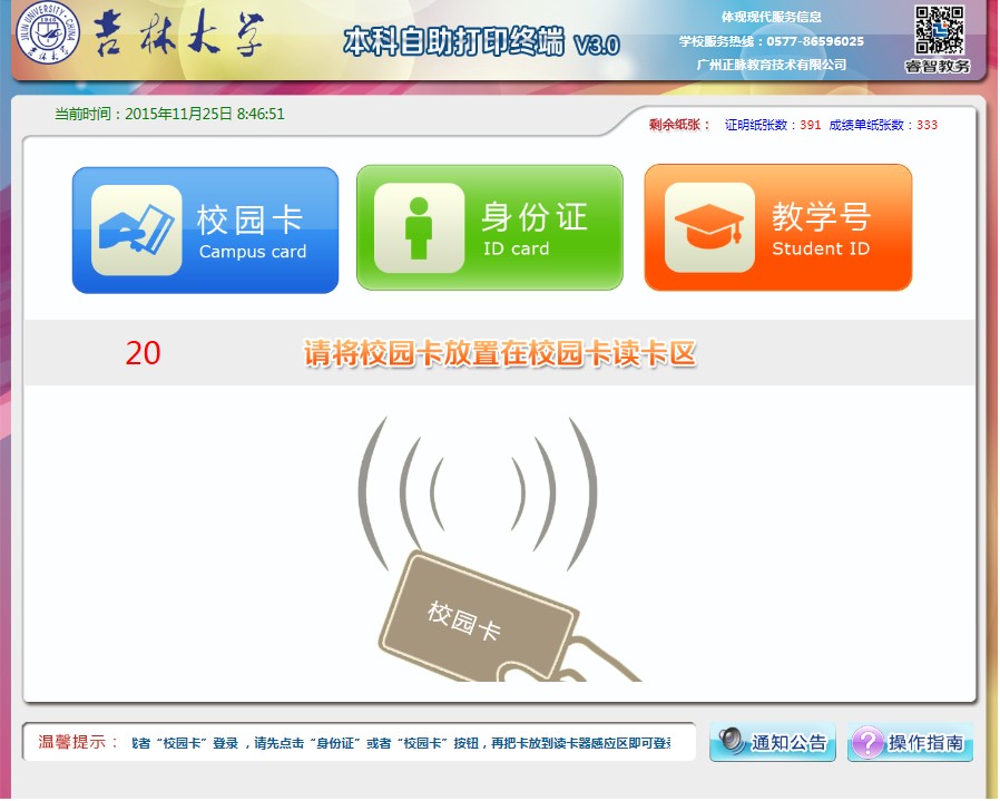 选择校园卡登录方式,点击校园卡图标后,提示20秒内刷卡登录,验证成功后登录系统,否则提示验证不通过原因。