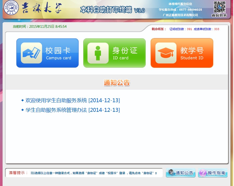(1)成绩单打印:全校在读本科生都可打印。成绩单纸张低于临界值时,系统自动禁止提供打印服务,并自动短信提醒管理人员添加纸张。