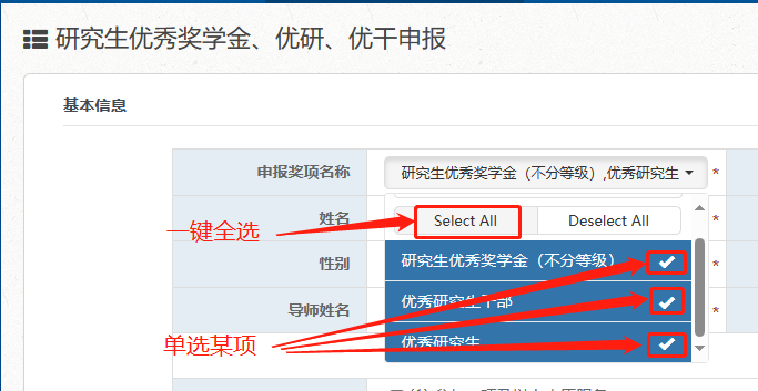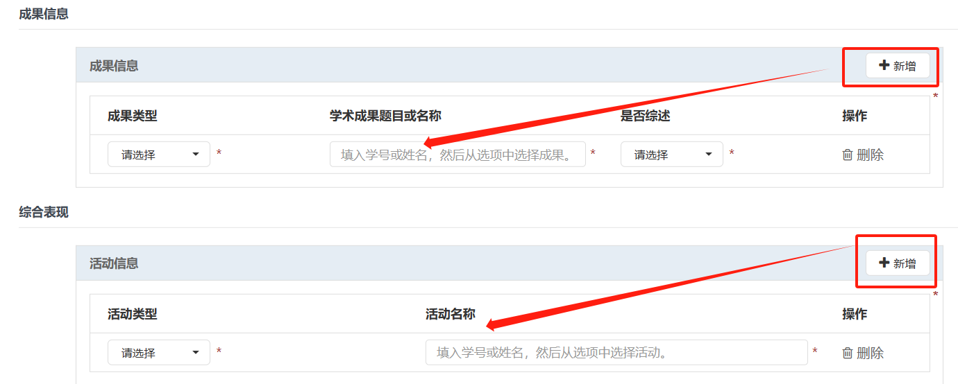 1、申报人请于10月13日8:00前使用个人邮箱账号登录“一张表”平台(//one.heiliaobase.com),在“研究生评奖评优管理”-“研究生评奖评优申报”栏,点击【新增(研究生优秀奖学金、优研、优干申报)】进行信息填报,申报研究生优秀奖学金无需选择等级,依据综合得分由高到低自动定级;成果信息栏点击“新增”后输入“姓名或者学号”,然后从已审核通过的成果库中选择不超过3篇代表作参评;活动信息点击“新增”后输入“姓名或者学号”,然后从已审核通过的活动中选择上一学年参与的活动。